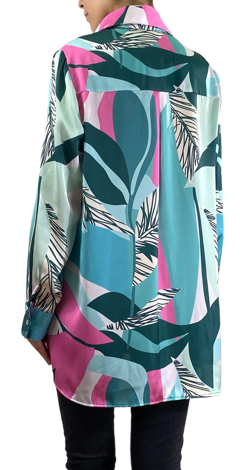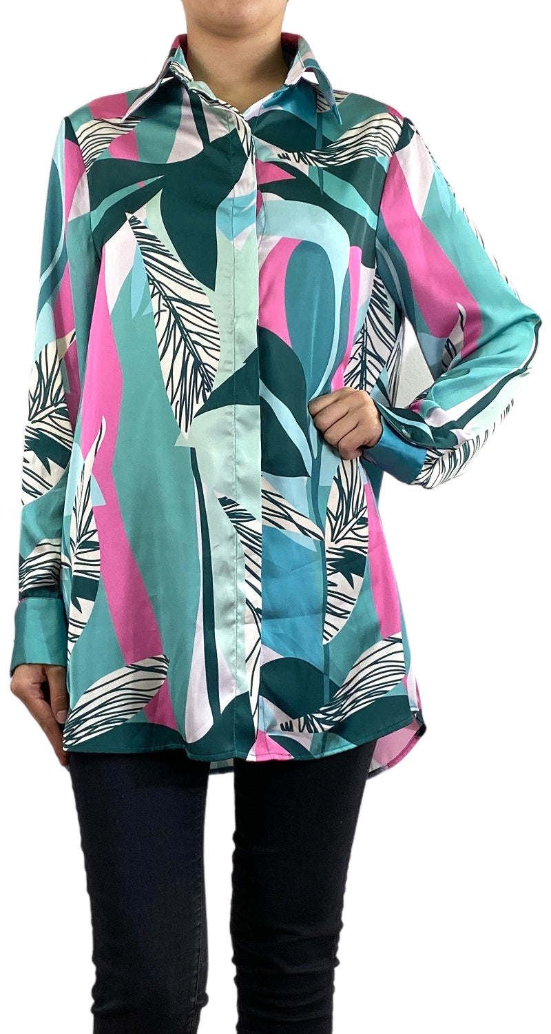 Blusa manga larga con estampado Multicolor satinado, botones en delantero ocultos.
