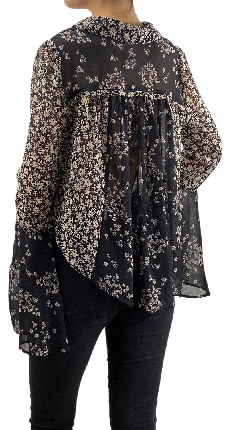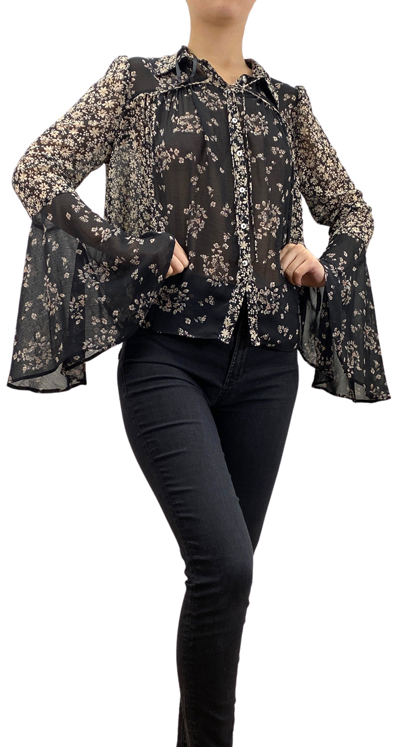 Blusa Negra traslúcida con estampado de flores, botones en delantero y mangas aglobadas.