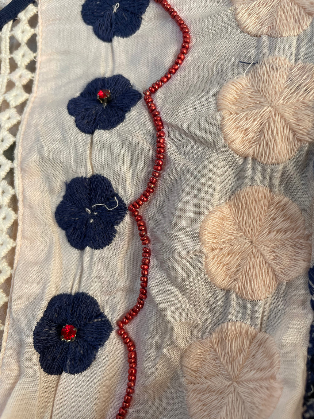 Blusa Rosada con bordado de flores, aplicaciones de mostacillas y macramé. Presenta falla en aplicaciones.