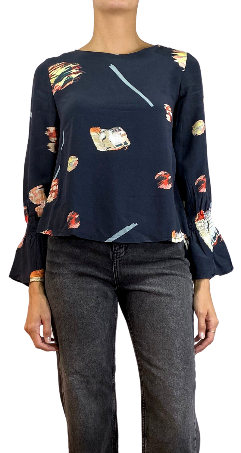 Blusa Negra con estampado Multicolor, diseño en mangas fruncidas.