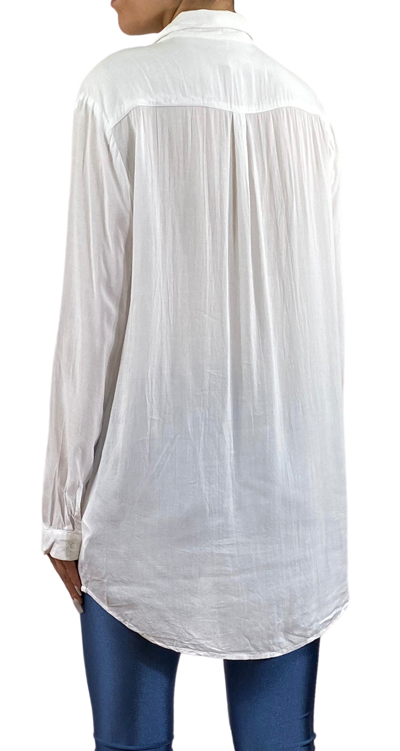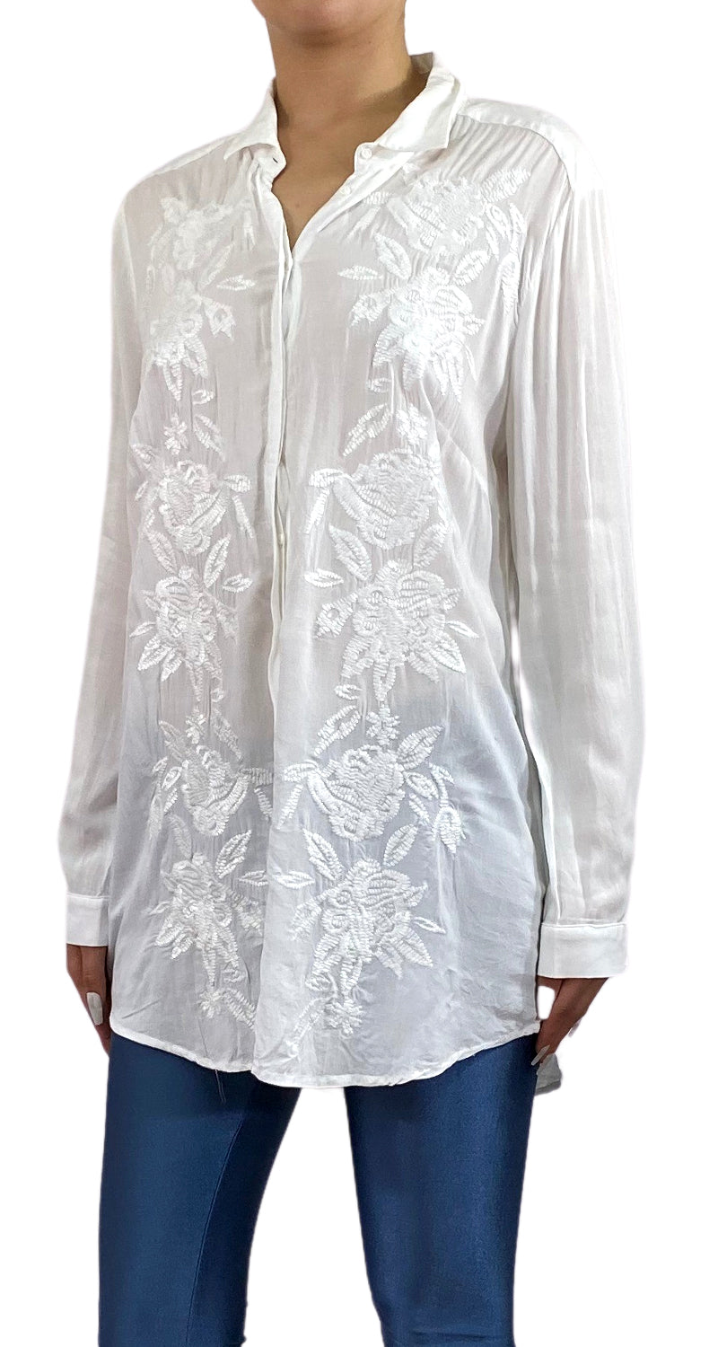 Blusa color Blanco con botones en delantero y bordado. Presenta pequeña mancha frontal que desaparece con lavado.