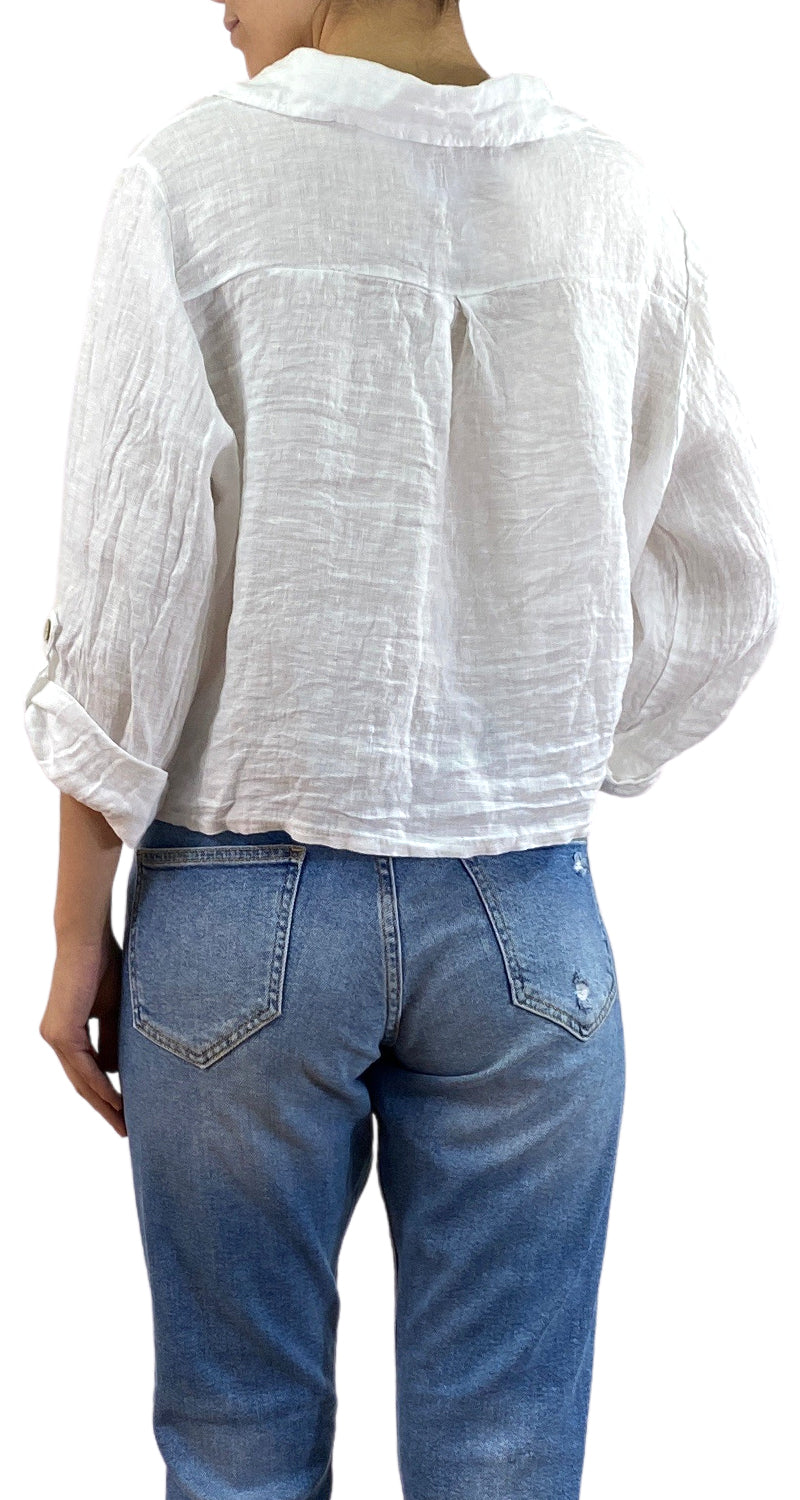 Blusa de lino color Blanco con botones en delantero nacarado y lazo frontal.