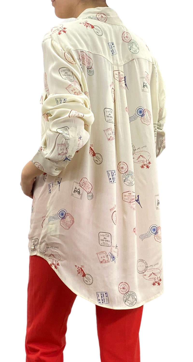 Blusa color crema con estampado Multicolor, botones y bolsillos sobrepuestos.
