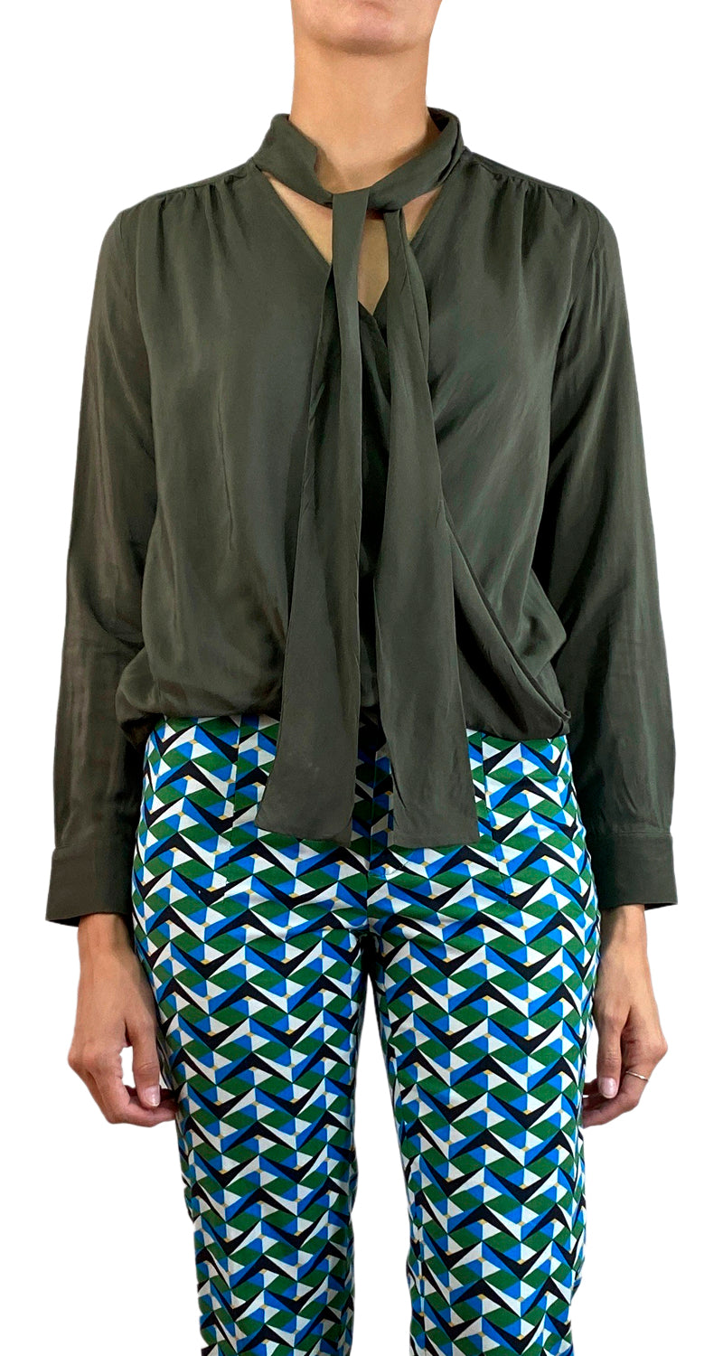 Blusa color Verde Oliva, la en cuello y escote en V.