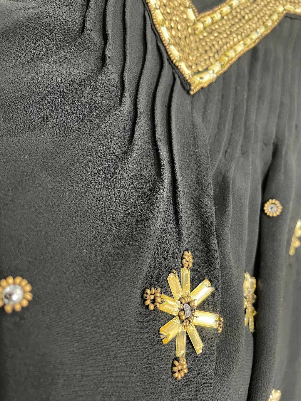 Blusa color Negro con aplicaciones de lentejuelas, mostacillas y brillantes en Dorado, alforzas en delantero, espalda y mangas. No especifica talla.