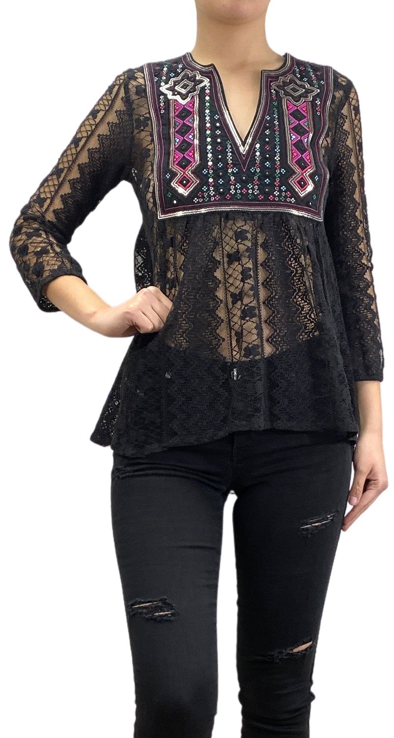 Blusa color Negro de encaje con escote en V y detalle de lentejuelas plateadas. El producto no especifica talla.