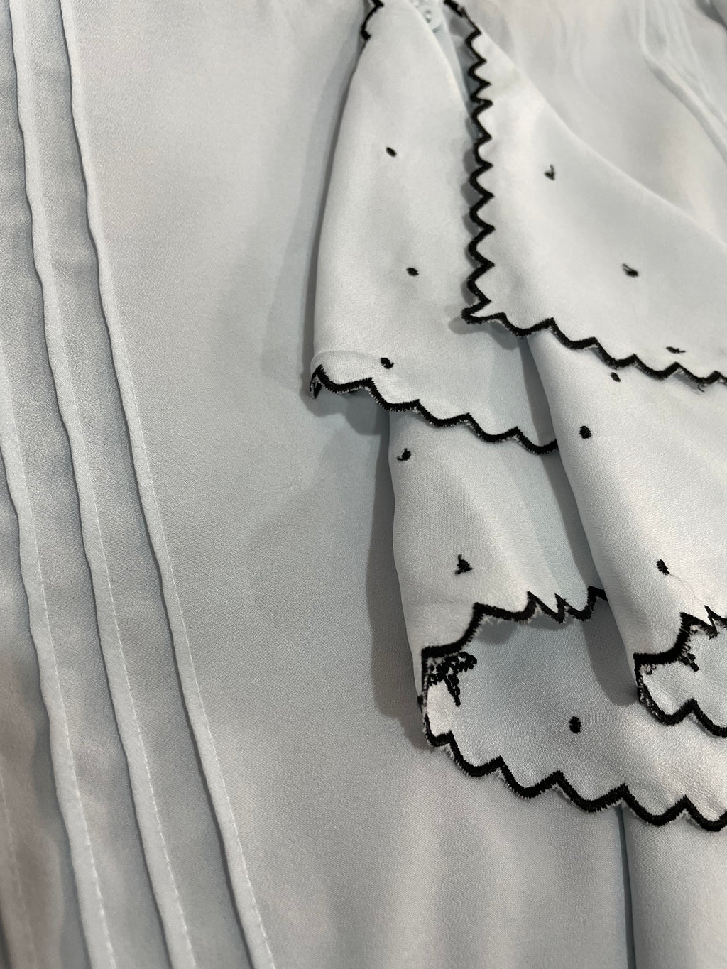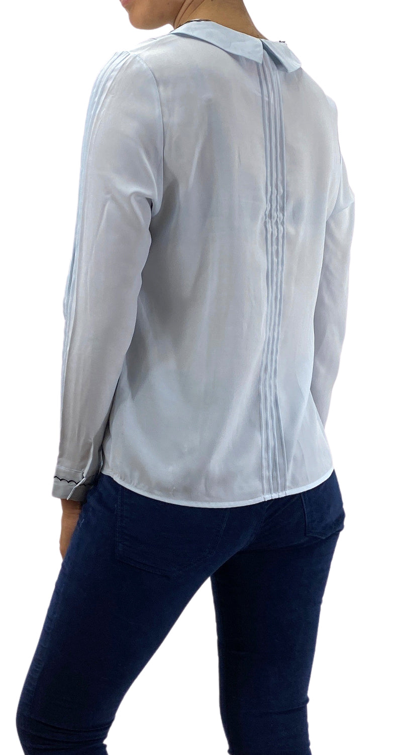 Blusa Celeste con volados en el delantero, bordado de estrellas en Negro y detalle de alforzas.