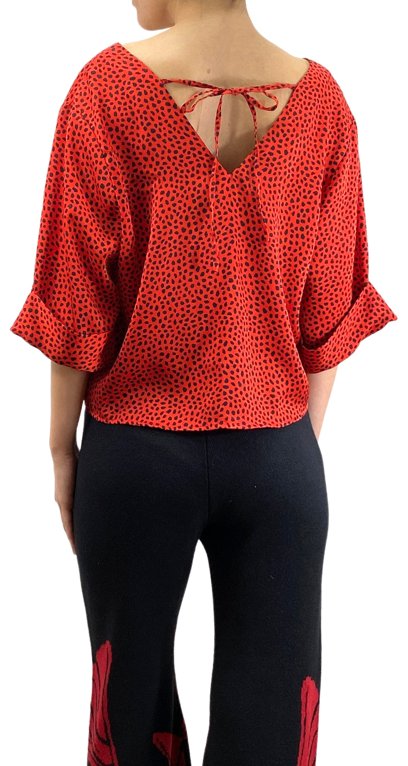 Blusa color Rojo con estampado de pintas Negras, escote en V con lazo en espalda y botones decorativos en delantero. Talla 38 EUR de la marca.