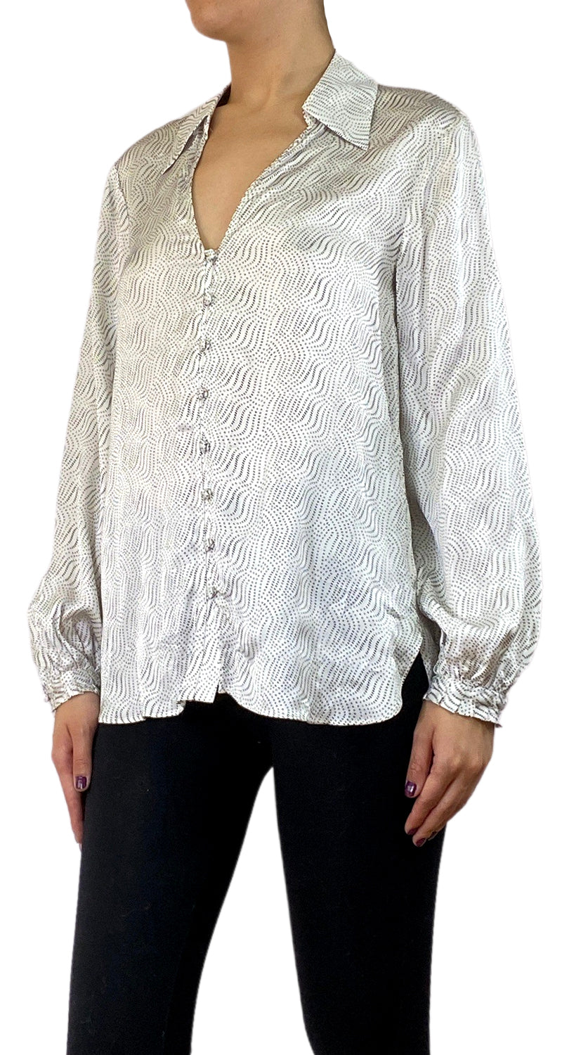 Blusa manga larga Blanca con estampado de puntos Negros, satinada con escote en V y botones