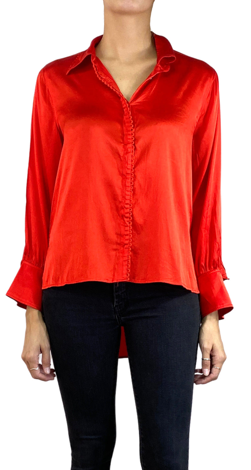 Blusa de Seda color Rojo con botones en delantero, manga larga y con diseño de vuelos. Talla 3 de la marca.