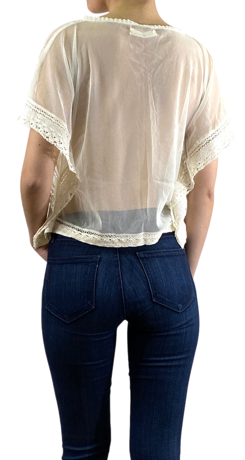 Blusa de malla traslucida con diseño bordado y encajes en color Crema.