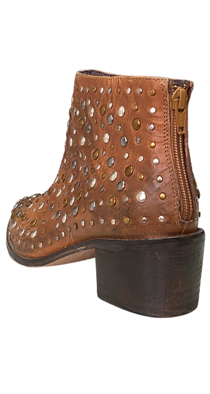 Botines color Café con aplicaciones de tachas en Plateado y Dorado, cierre en talón, tacón de 5,5 cm. Marca Americanino.