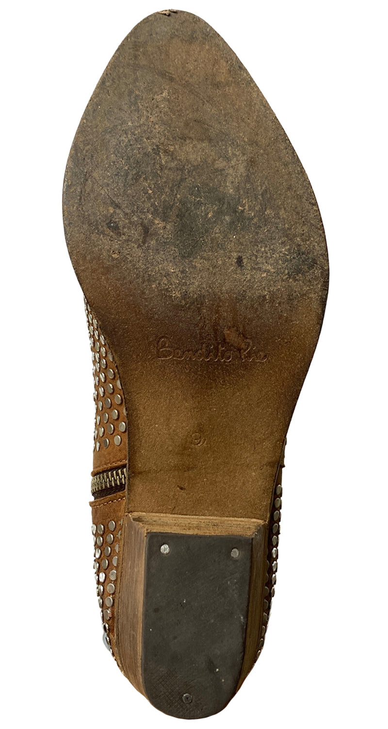 Botín estilo western de cuero Café con múltiples tachas en tonos Plateado, con cierre en lateral y tacón de 5 cm. Las compras efectuadas de la categoría calzado, no tienen derecho a cambios ni devoluciones.