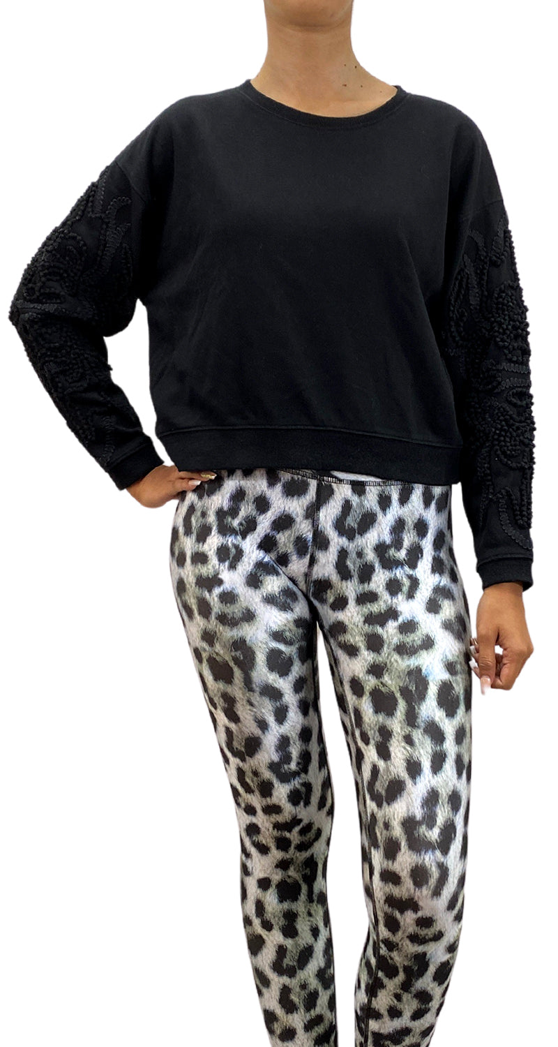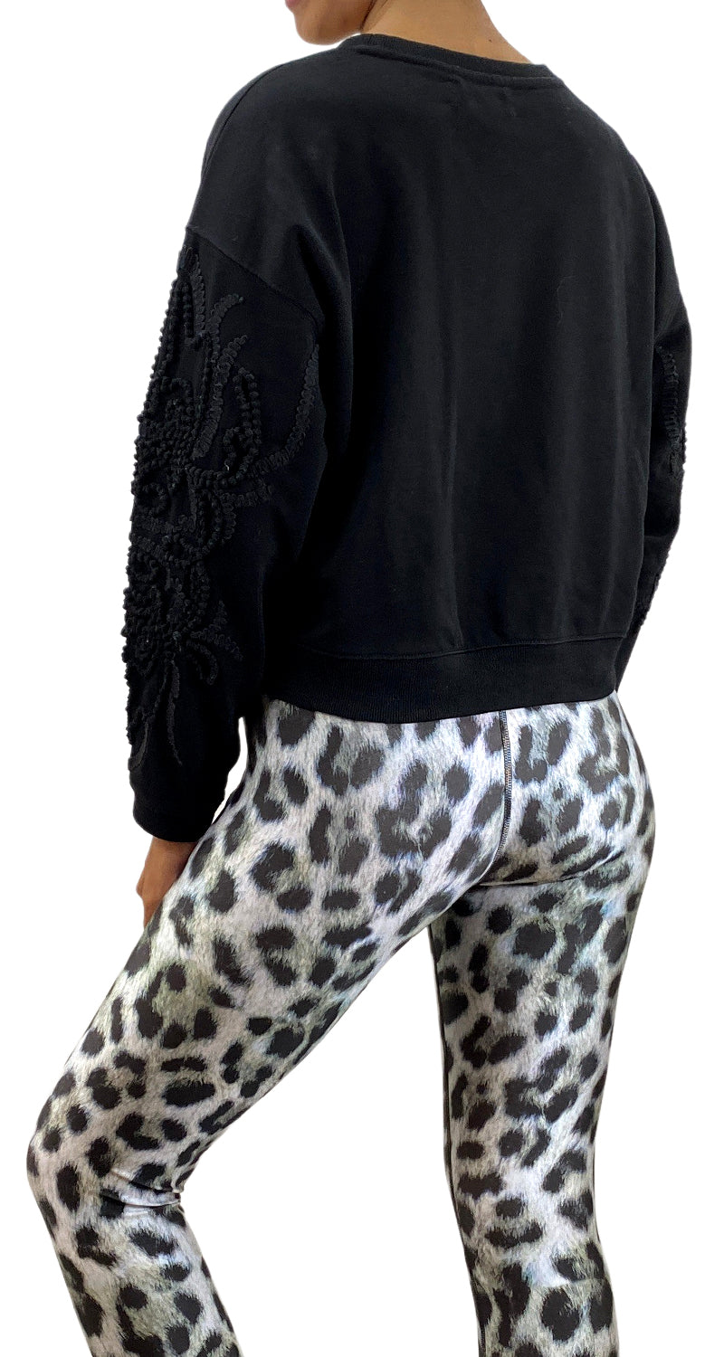 Polerón buzo color Negro de cuello redondo con diseño de macramé en mangas.
