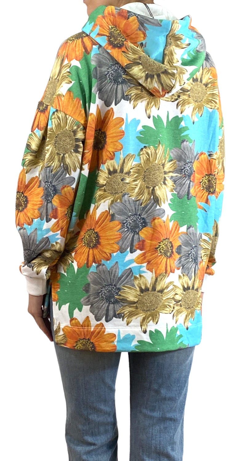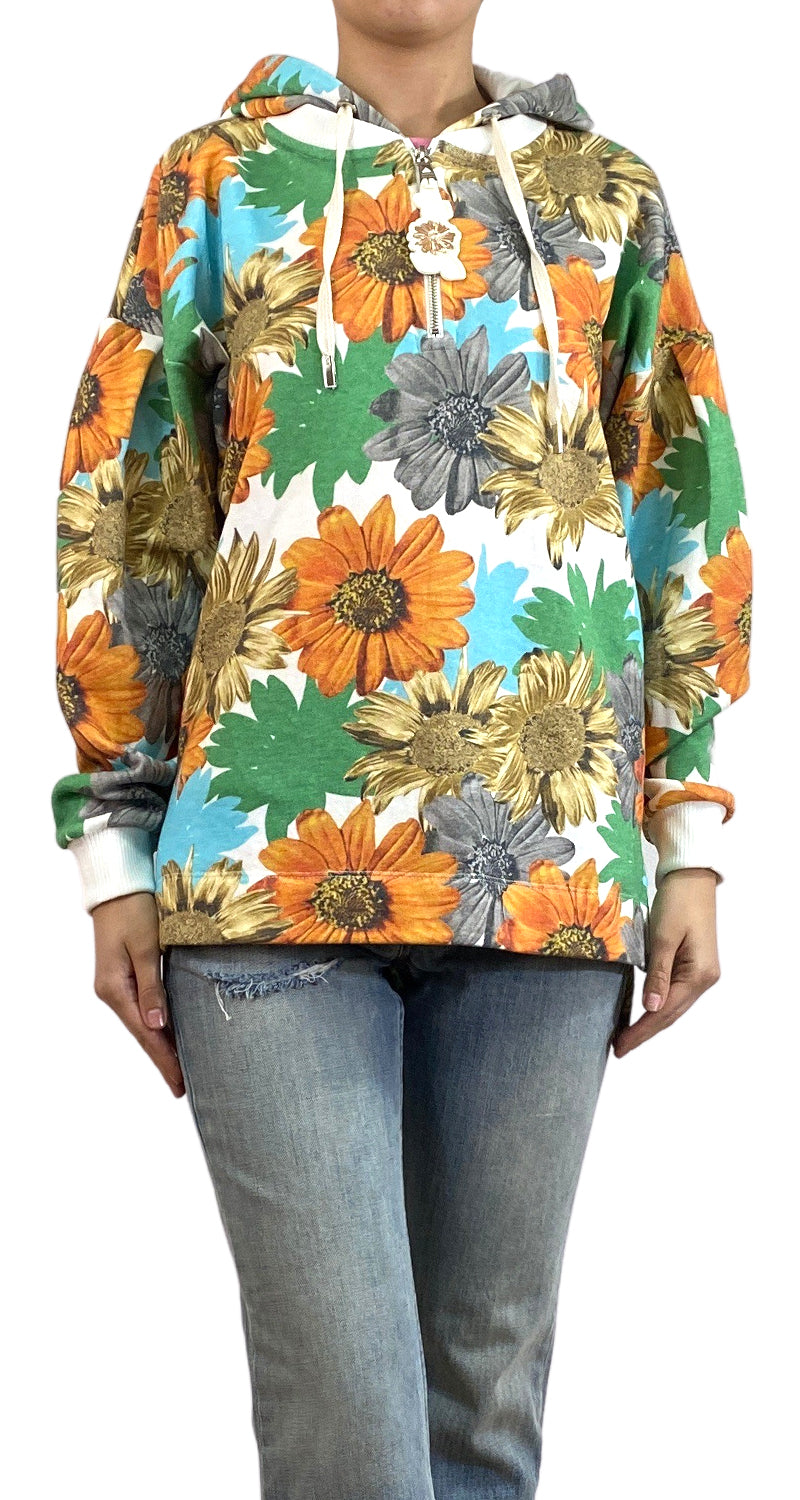 Polerón con estampado de flores en Multicolor, capucha con cordón y cierre frontal, abertura en laterales. Talla 1 de la marca.