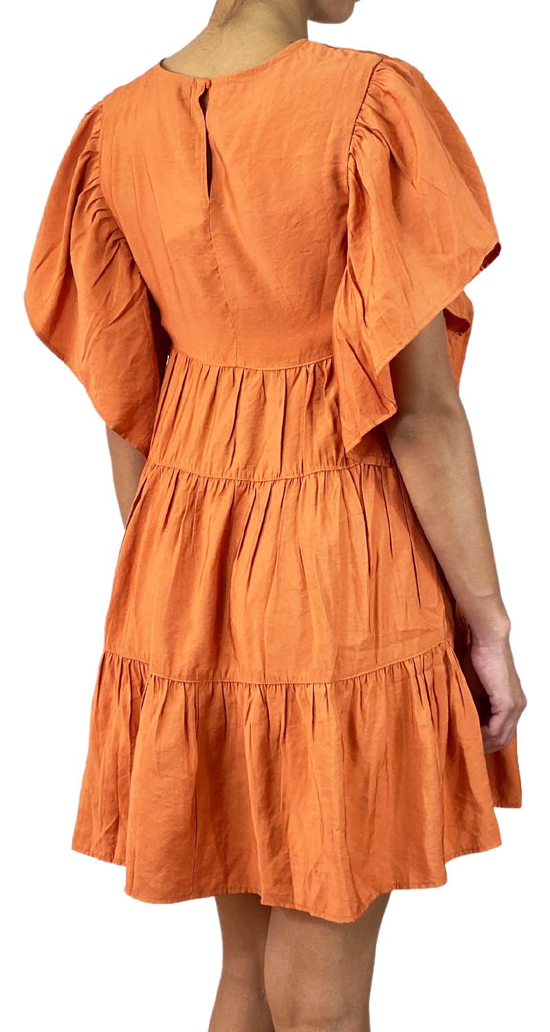 Vestido Camel manga corta con detalles en costuras cuello redondo.