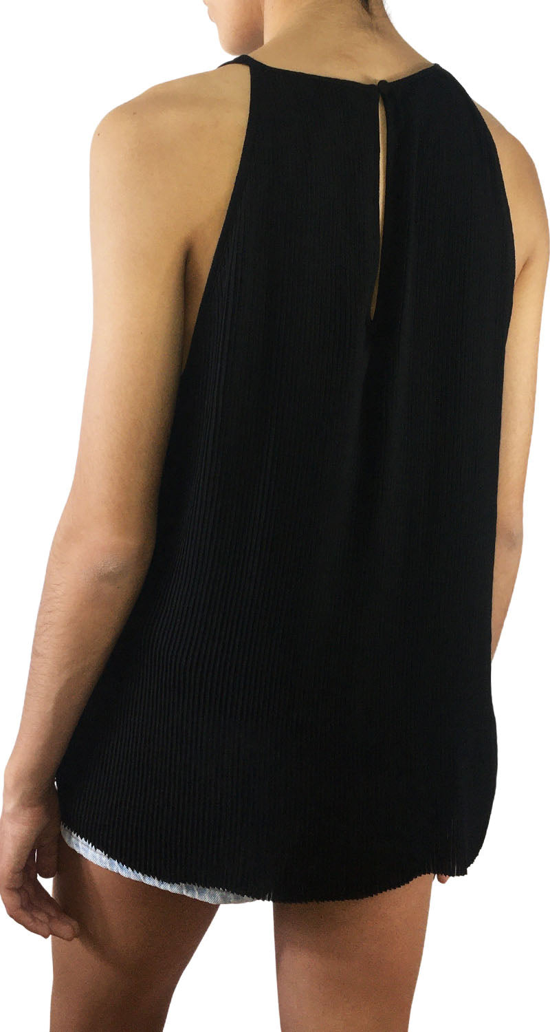 Polera plisada color Negro sin mangas y cuello redondo y ruedo desflecado.