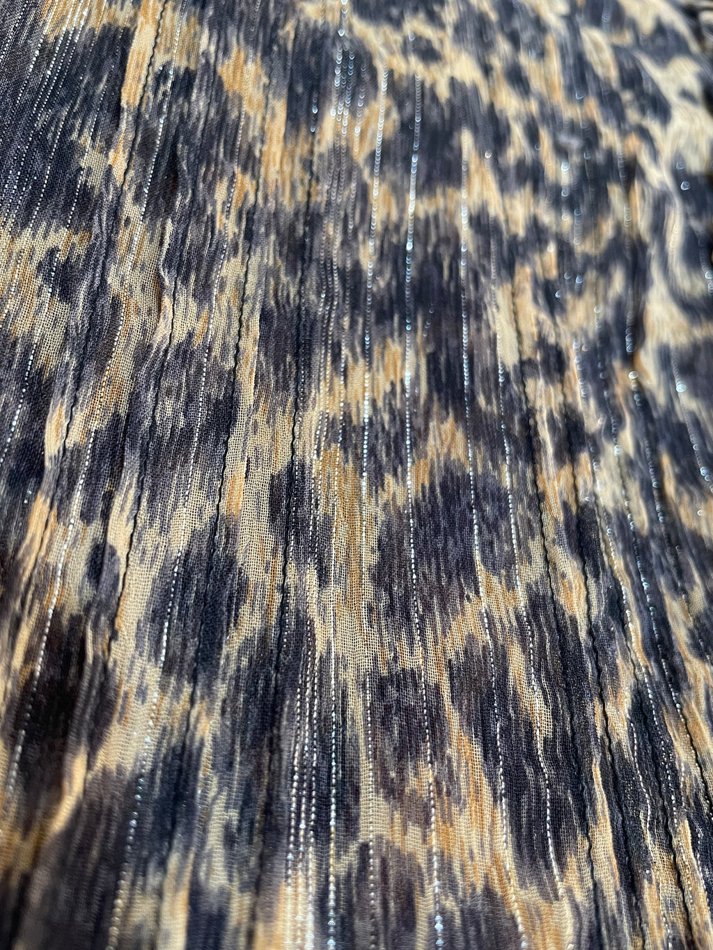 Blusa traslucida con estampado Animal Print, hilos metalizados y vuelos, cordón en inferior para ajuste.