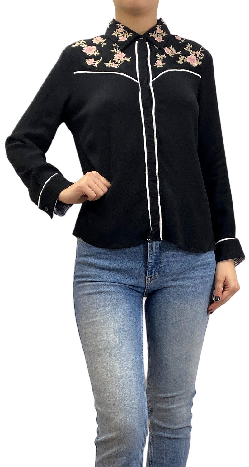Camisa color Negro con líneas en Blanco y diseño bordado de flores en delantero.