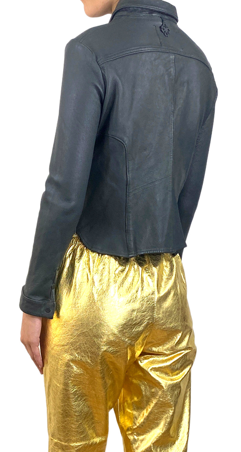 Camisa de cuero color Negro con bolsillos delanteros, broches negros frontales y en mangas.