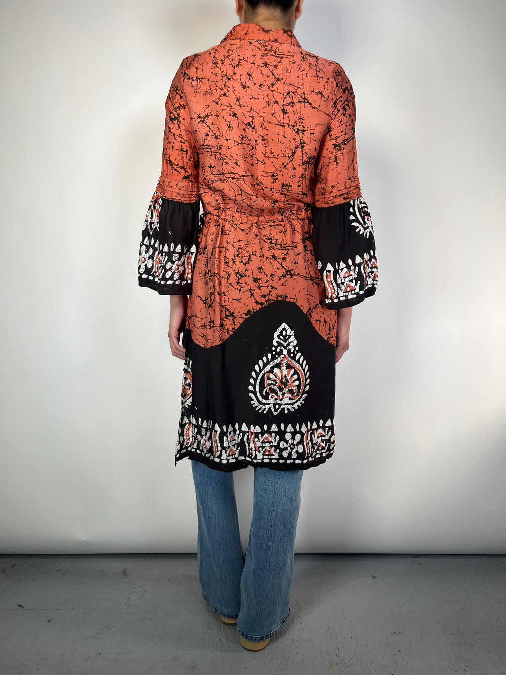 Camisa larga con diseño paisley, en color Rosado y Negro, abertura a los laterales, botones en delantero y centro ajustable.