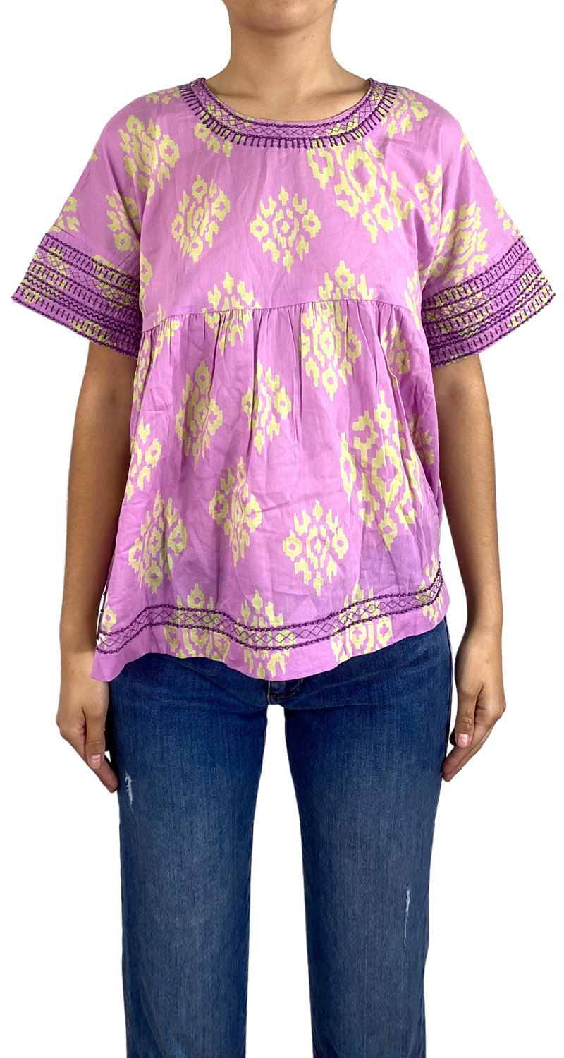 Camisa color Morado con estampado en Verde, diseño de bordado con canutillo, abertura en espalda con botón y cuello redondo.