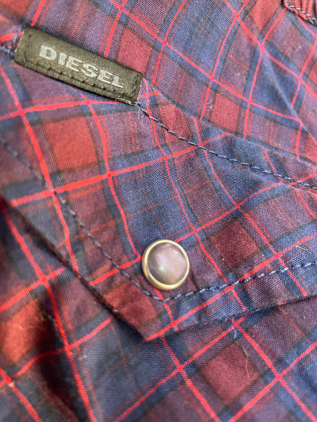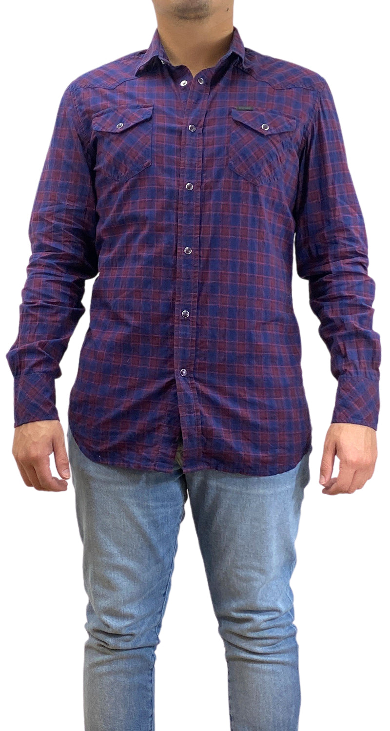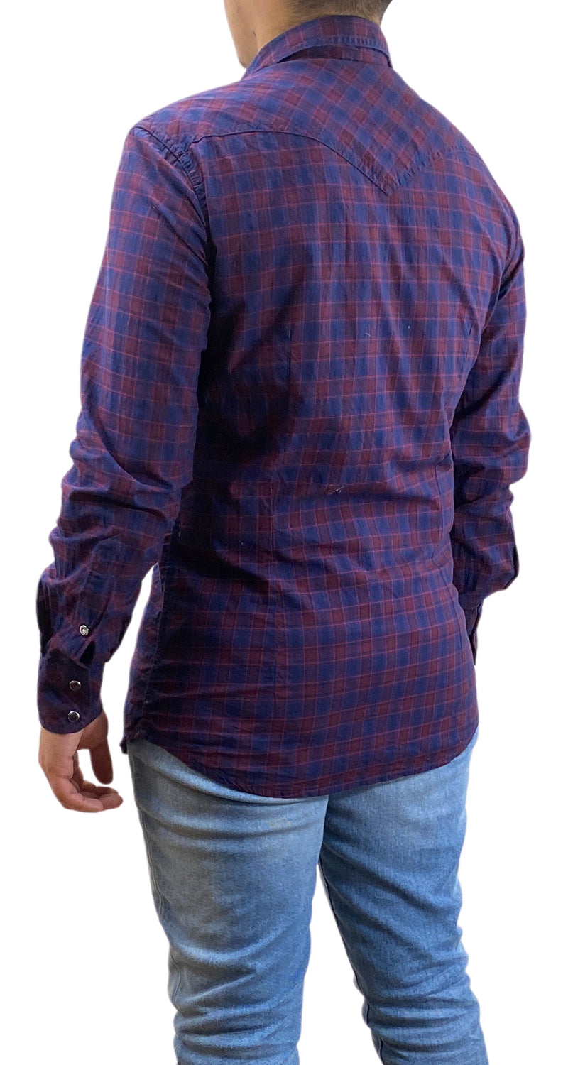 Camisa a cuadros en color Azul Mariano y Burdeo, dos bolsillos en delantero y botones de broches a presión.
