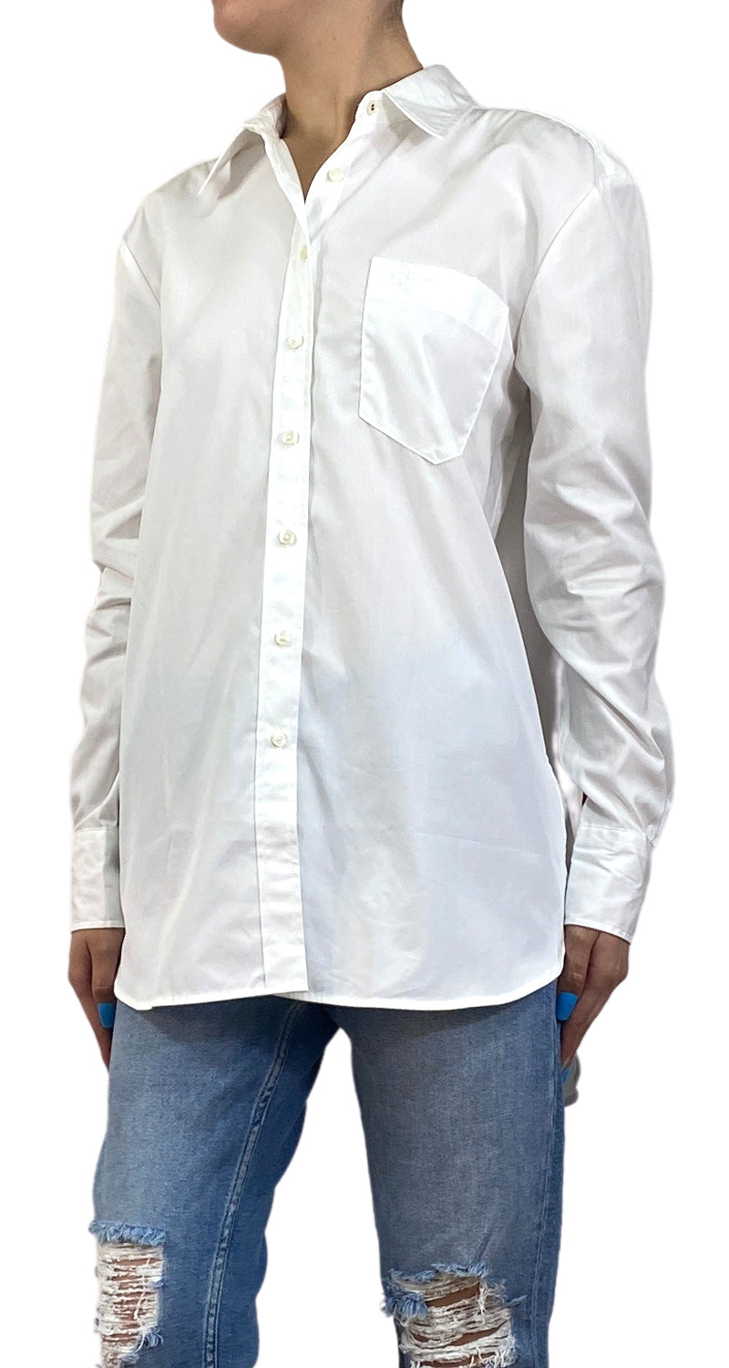 Camisa Blanca manga larga con bolsillo frontal, diseño de líneas en espalda y mangas color Roja, Azul y Blanca, Talla 38 EU de la marca.