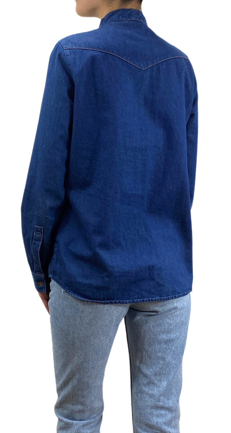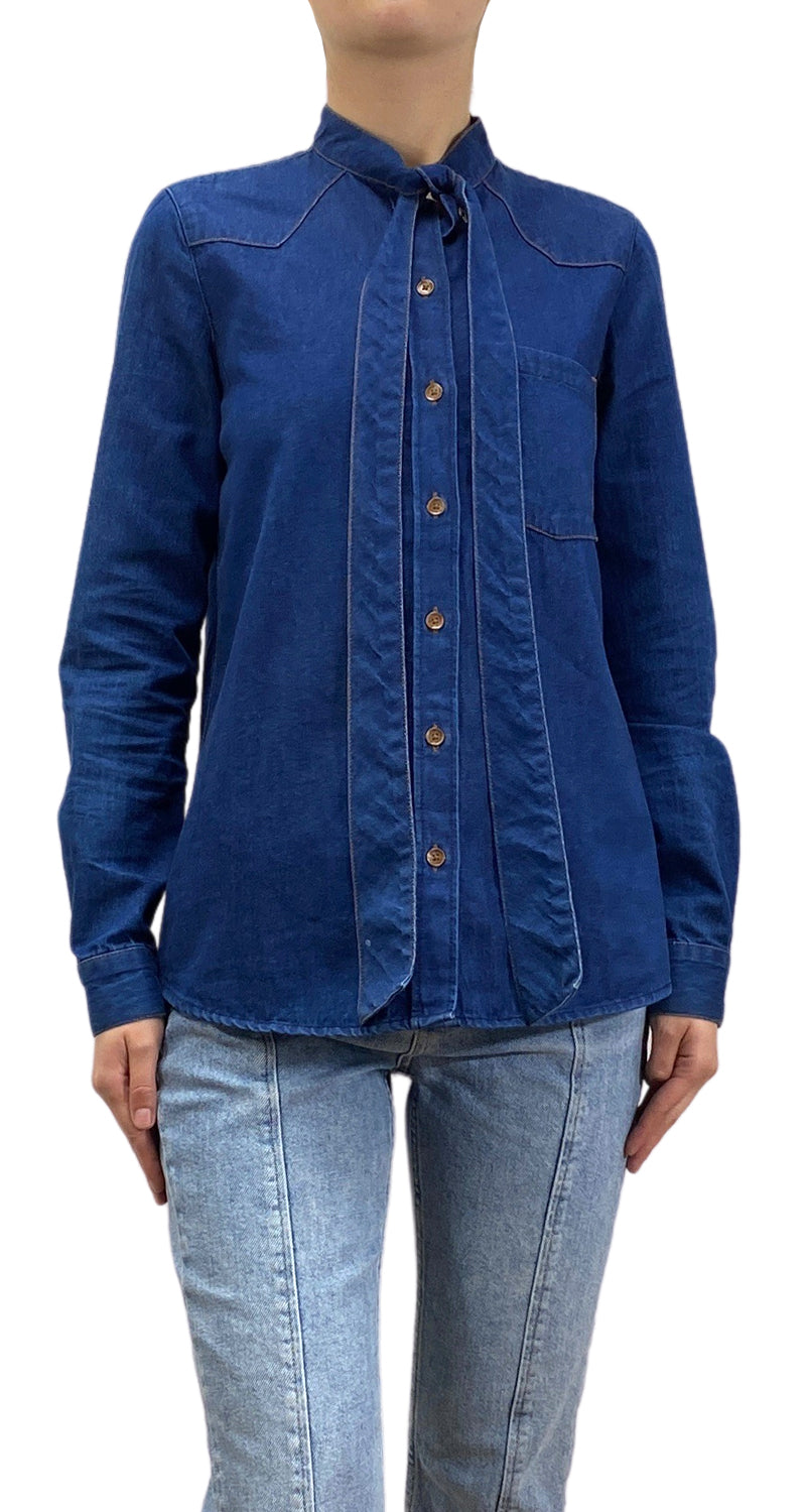 Camisa Denim color Azul con bolsillo sobrepuesto en delantero y lazo en cuello.