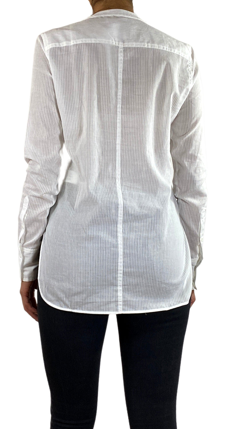 Camisa Blanca traslucida, cuello Mao con escote en V y botones ocultos en delantero.