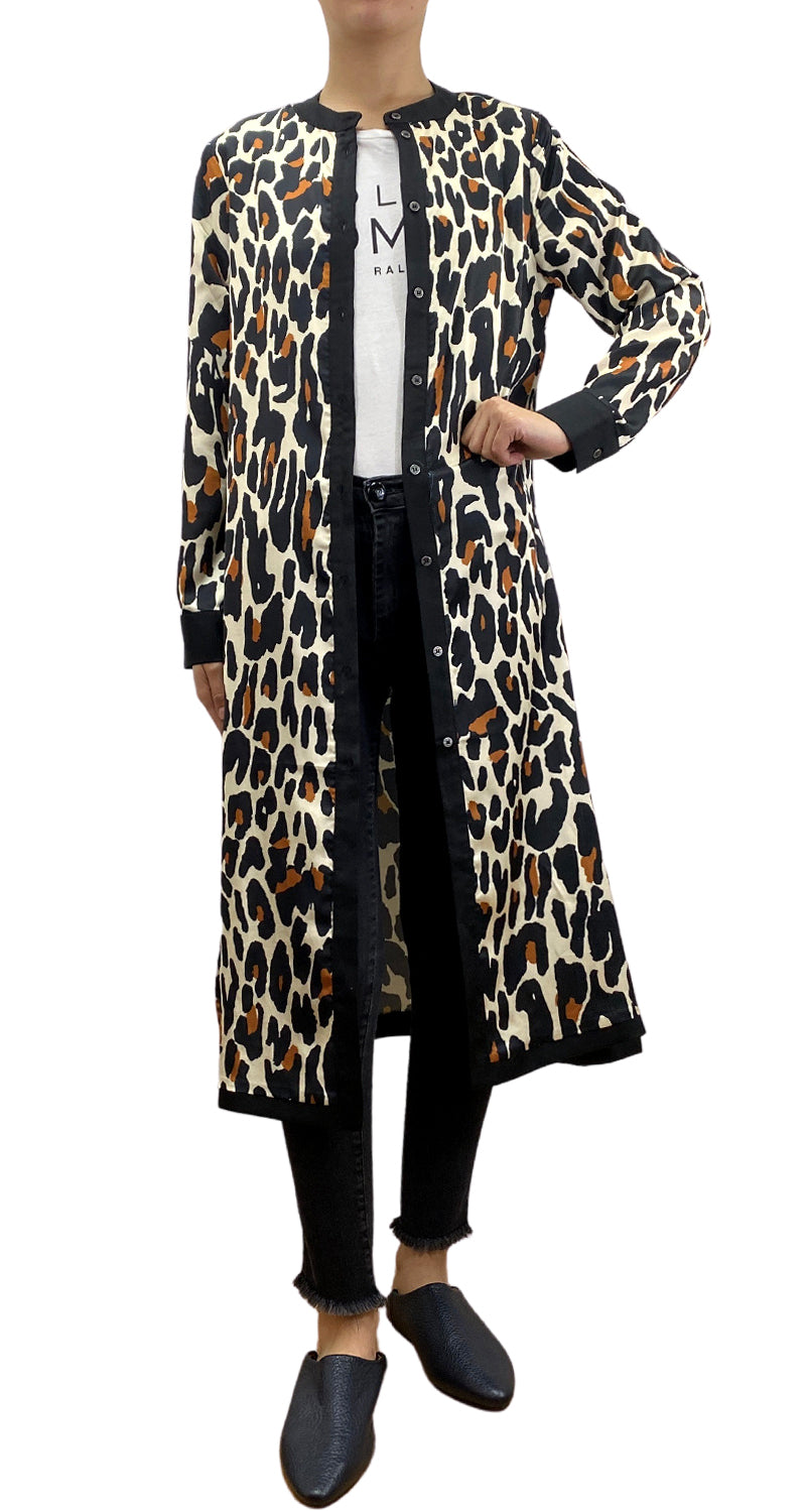 Vestido camisero con aberturas a los costados y estampado Animal Print. Presenta detalles de hilos corridos. Altura de modelo 1,68