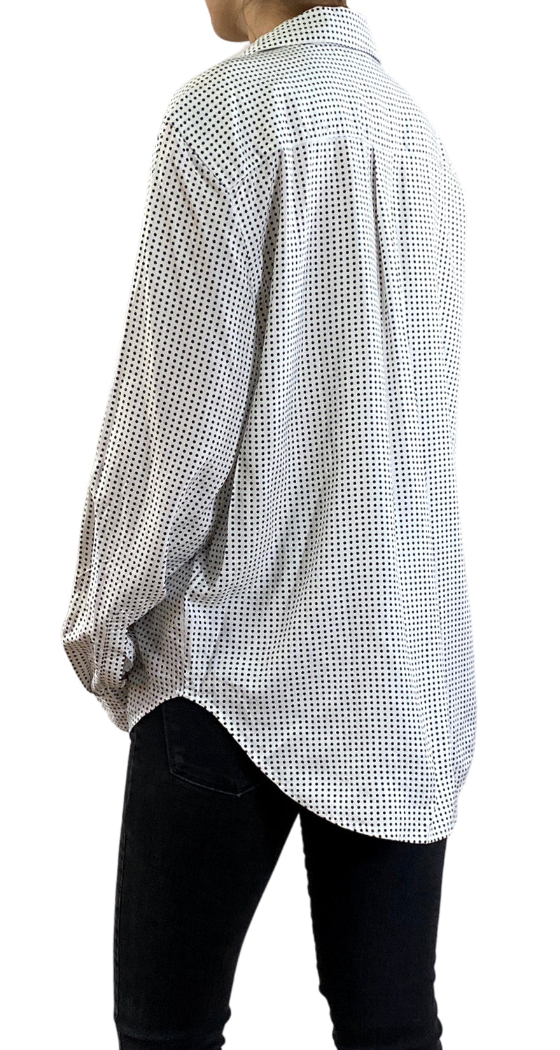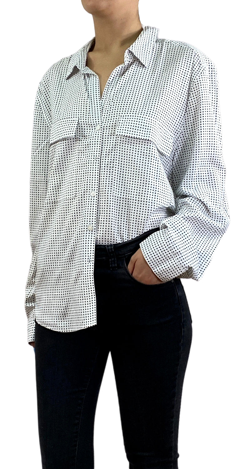Camisa Blanca con estampado de lunares en Negro, bolsillos frontales.