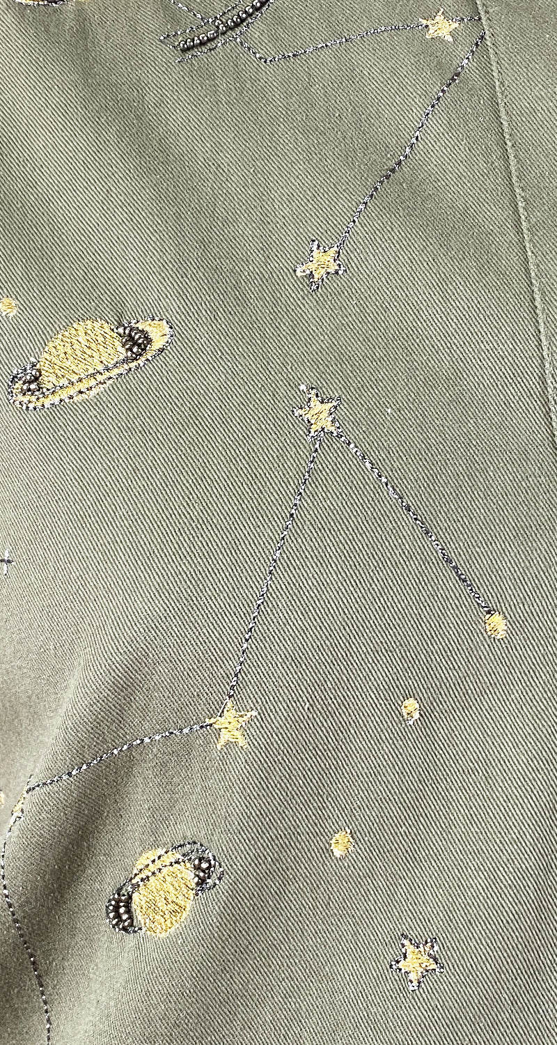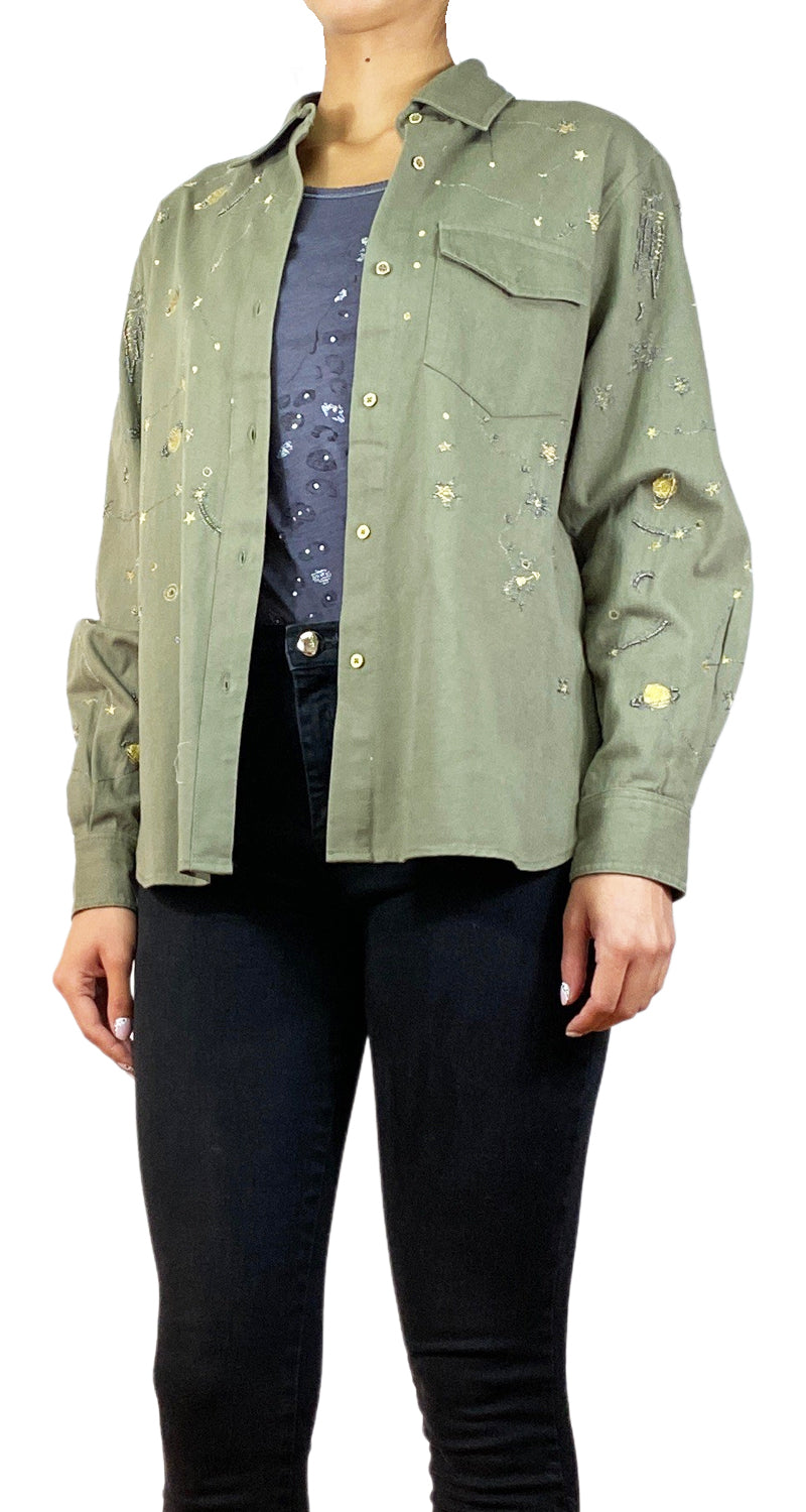 Camisa color Verde, con estampado en bordado Dorado y Plateado, bolsillo en delantero y botones.