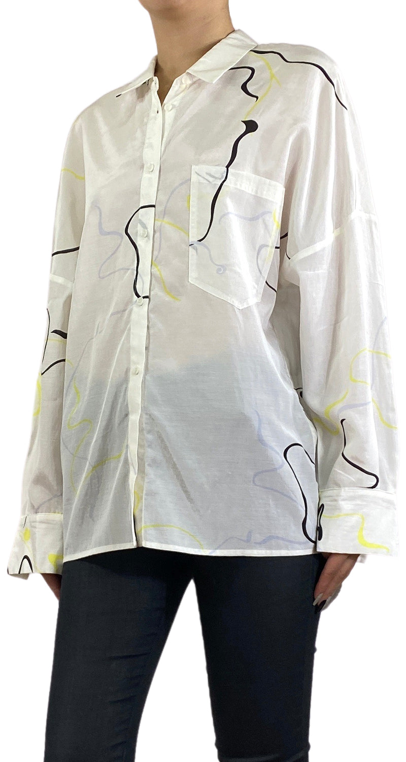 Camisa color Marfil traslucida con estampado en Negro y Amarillo, bolsillo en delantero.