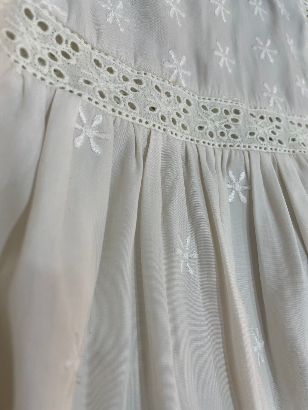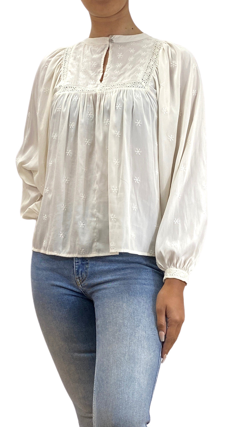 Blusa Blanca con estampado bordado, detalles plisados en mangas, delantero y espalda.