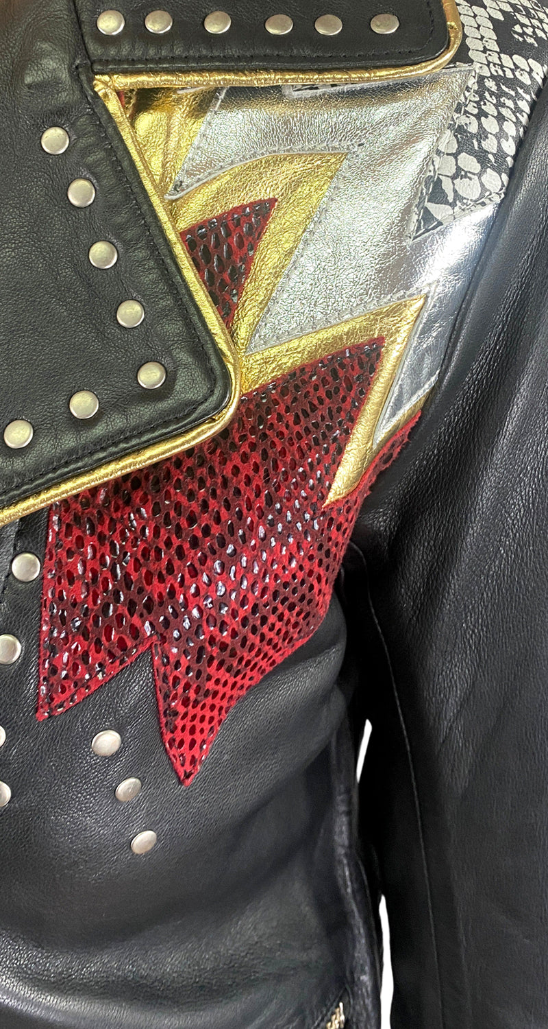 Chaqueta de cuero color Negro con apliques de Animal Print, Dorado y Plateado en delantero y espalda, solapa con borde Dorado y tachas Plateadas.
