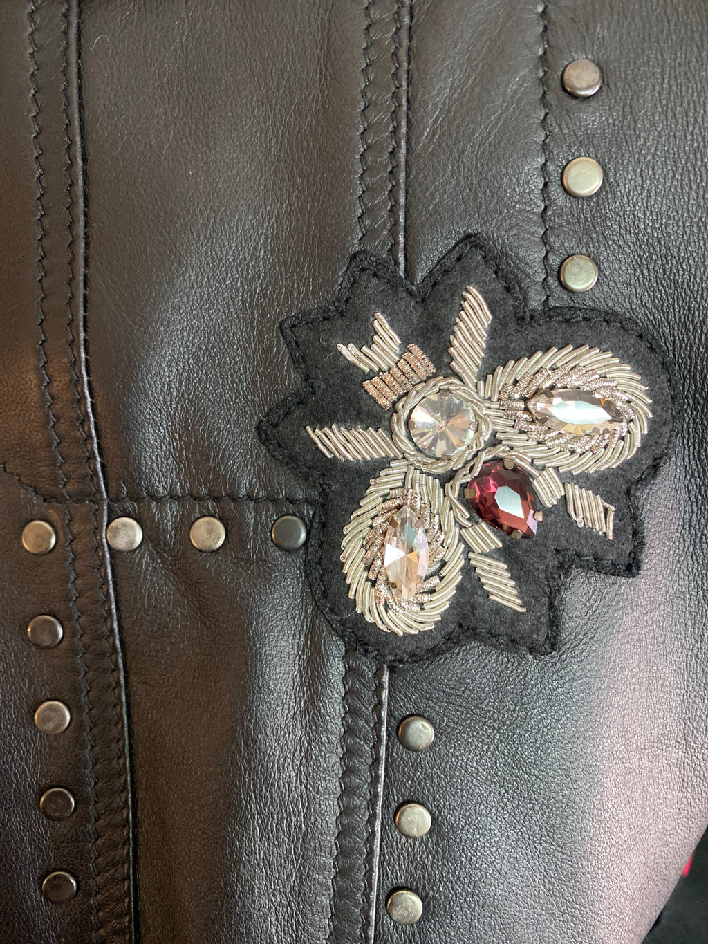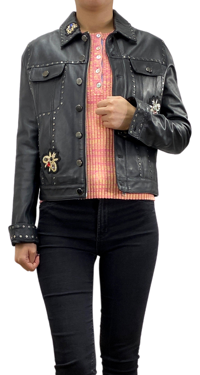 Chaqueta color Negro de cuero con diseño de tachas, aplicaciones y bordado en espalda.