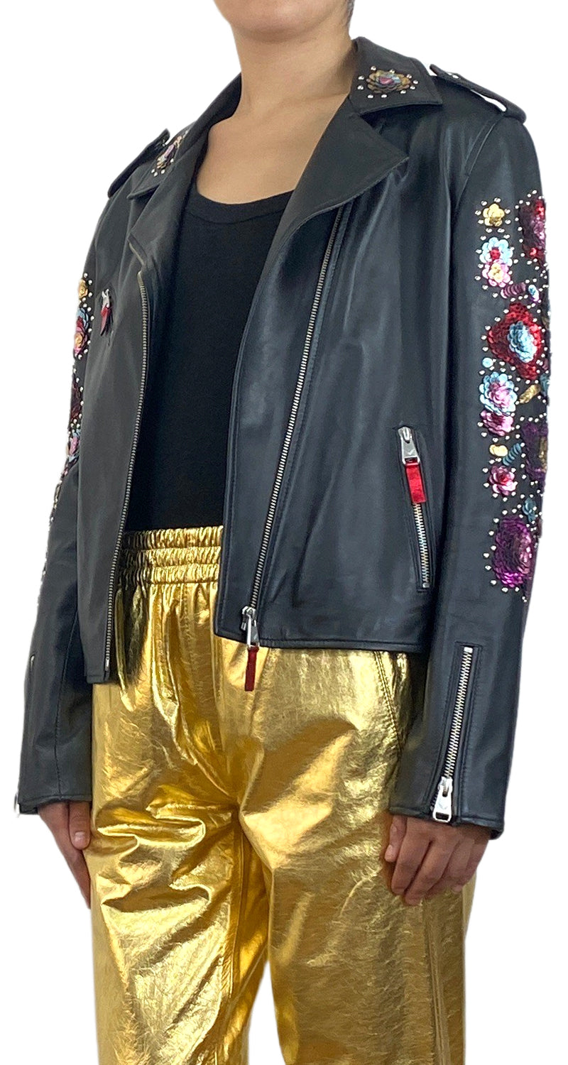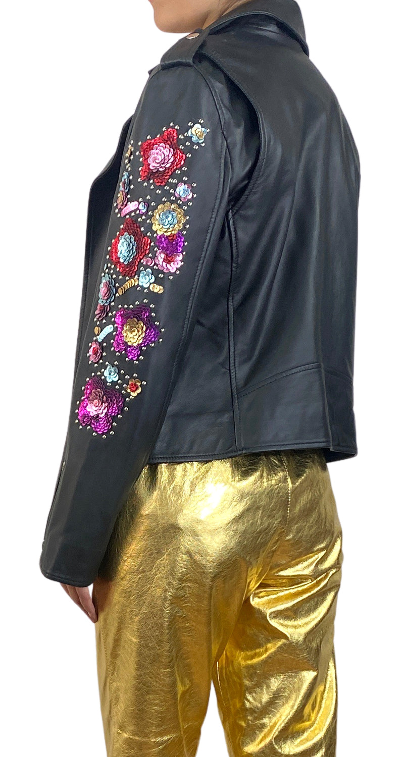 Chaqueta de cuero Negro con aplicaciones Multicolor en brazos y cuello, 3 bolsillos delanteros, cierre frontal y en mangas.