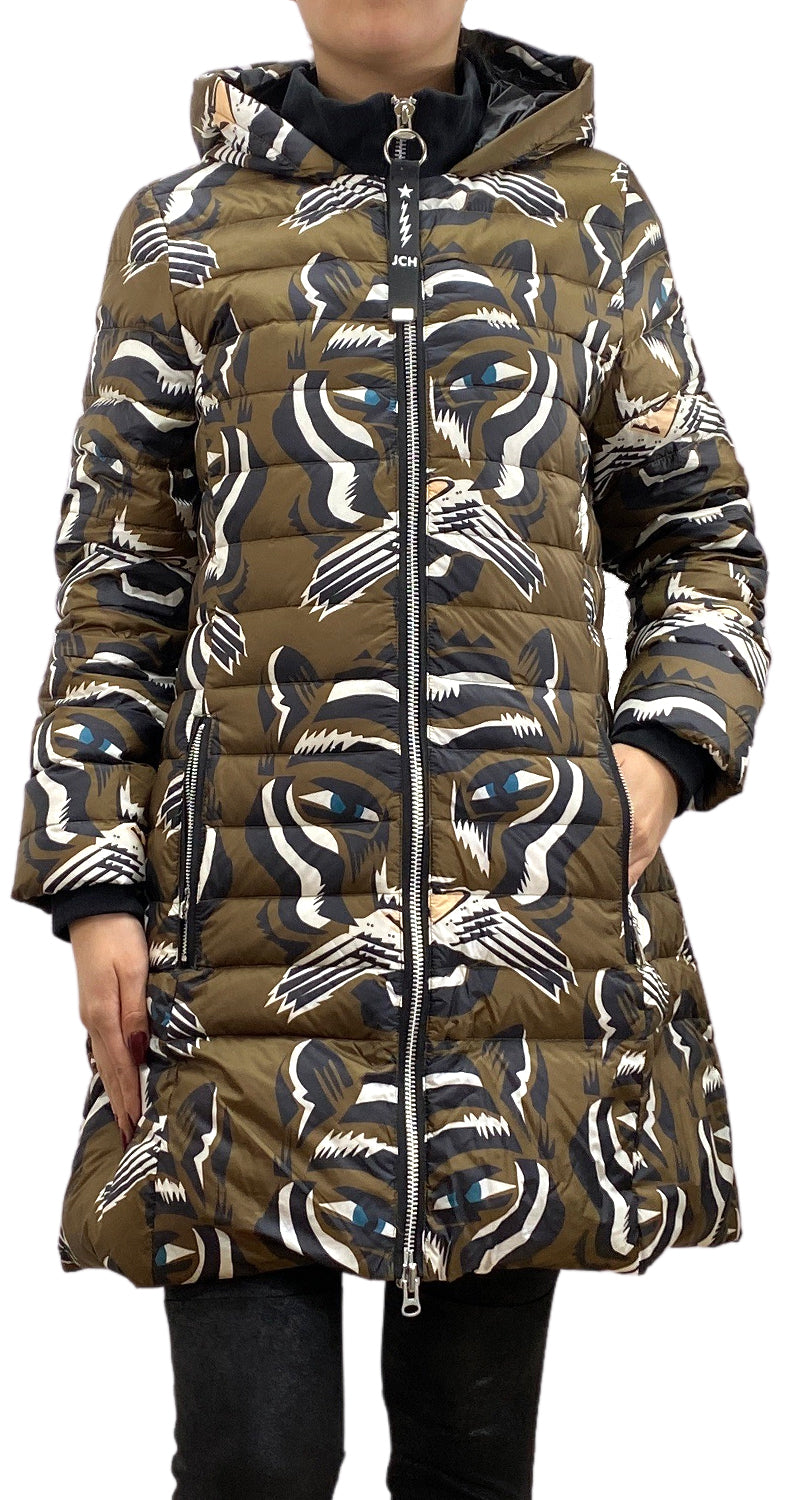 Parca color Verde olivo con estampado de tigres y bolsillos frontales. Talla 2 de la marca.