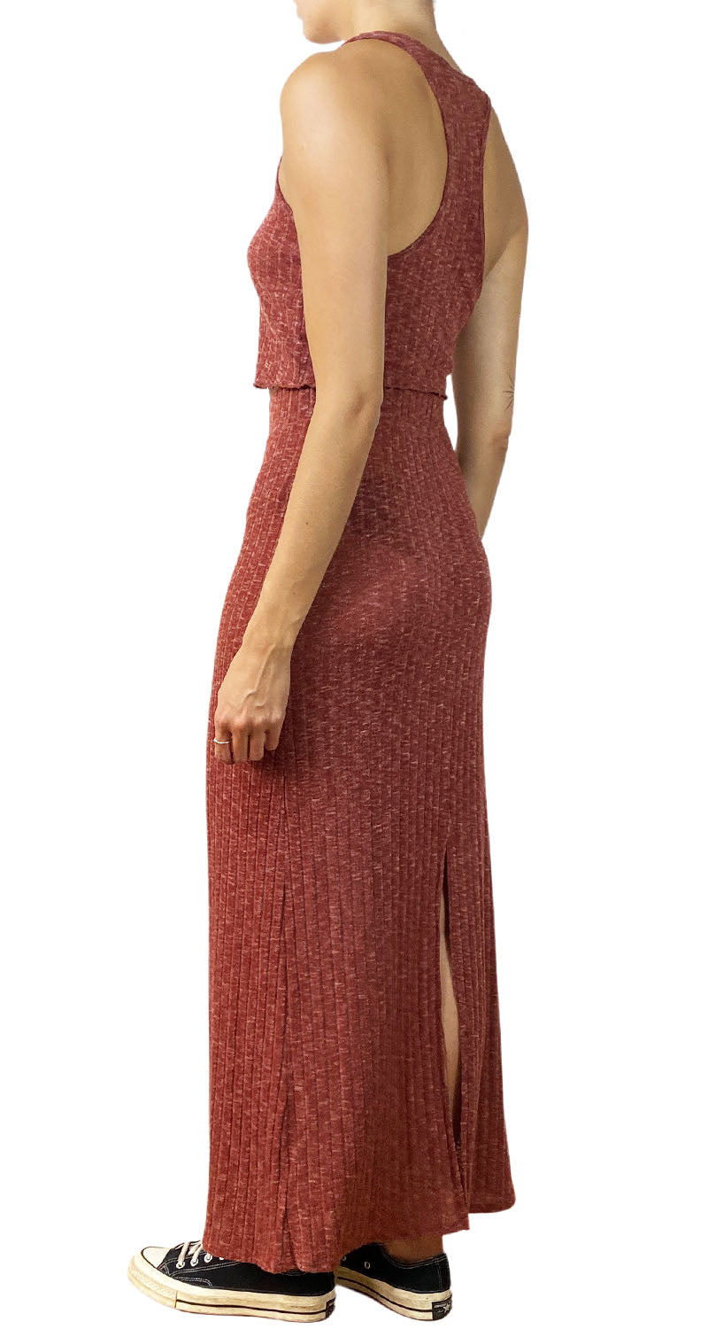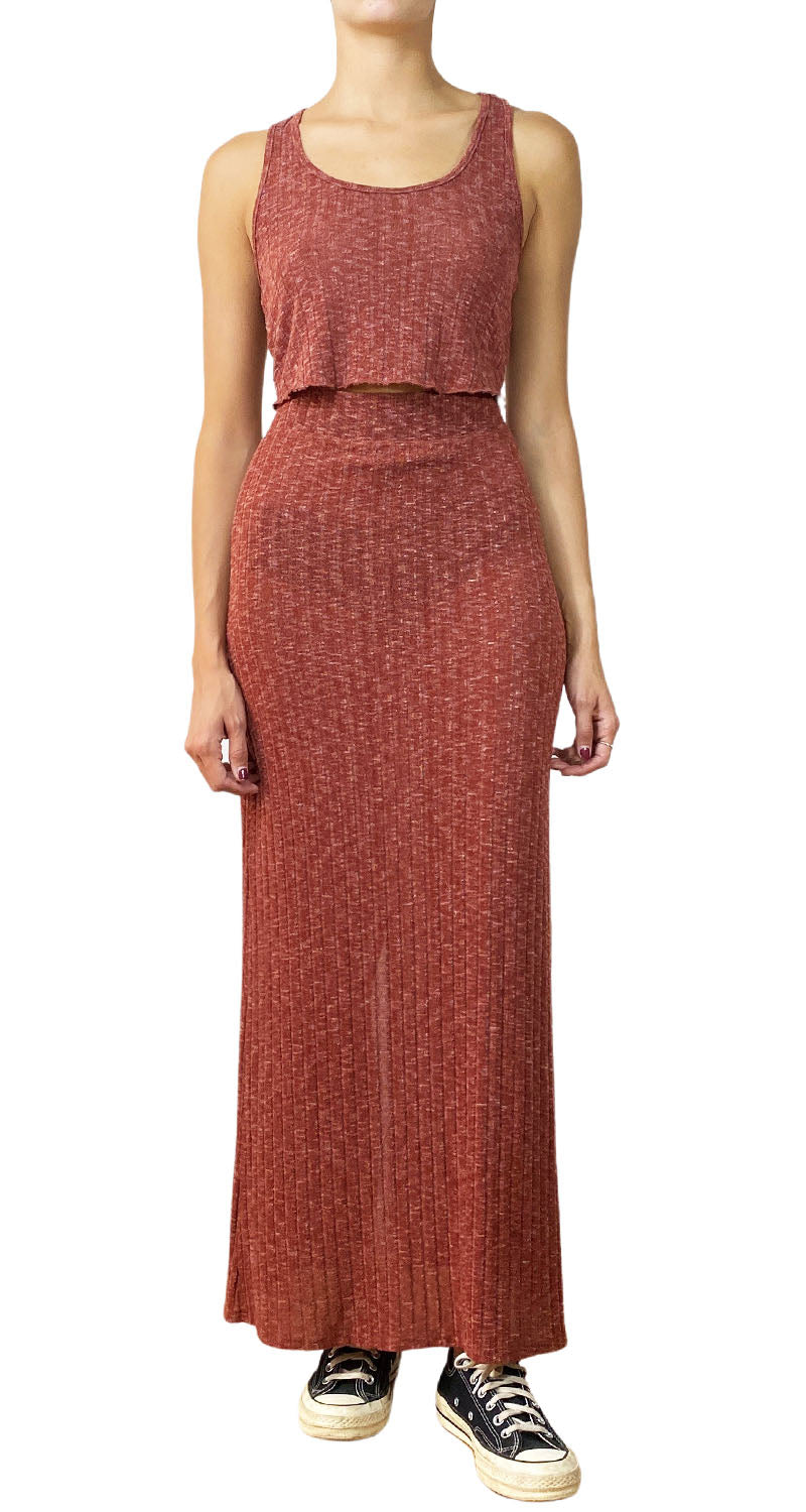 Set falda y crop top de canelé. Falda maxi con cintura elasticada, crop top sin mangas de espalda cruzada.