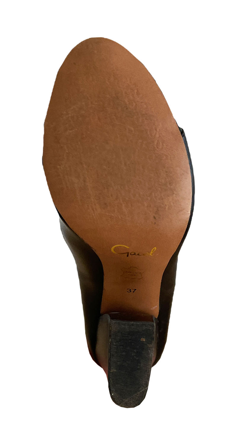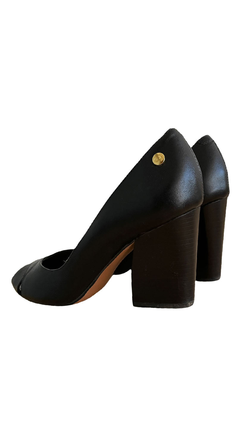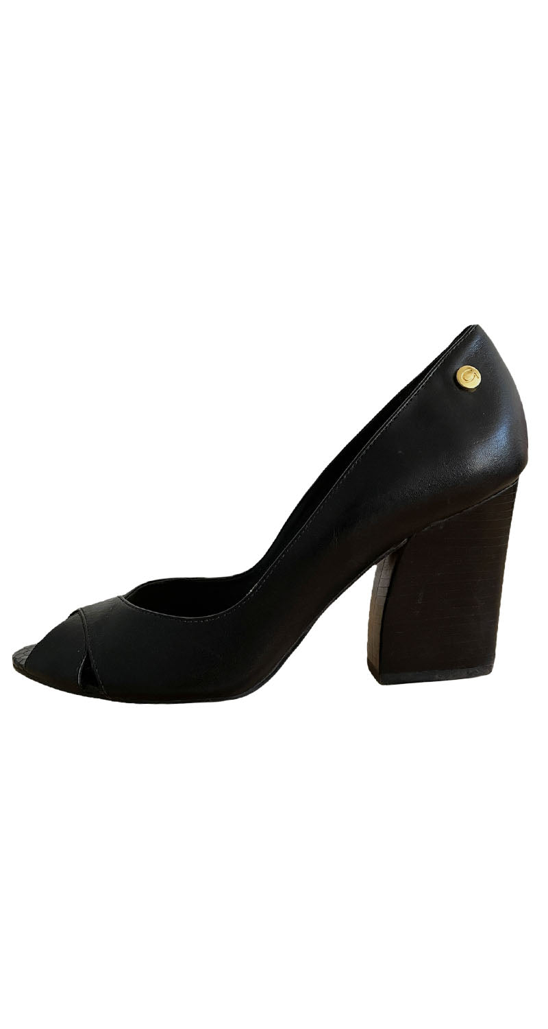 Sandalias taco alto color Negro correas cruzadas con abertura en los dedos.