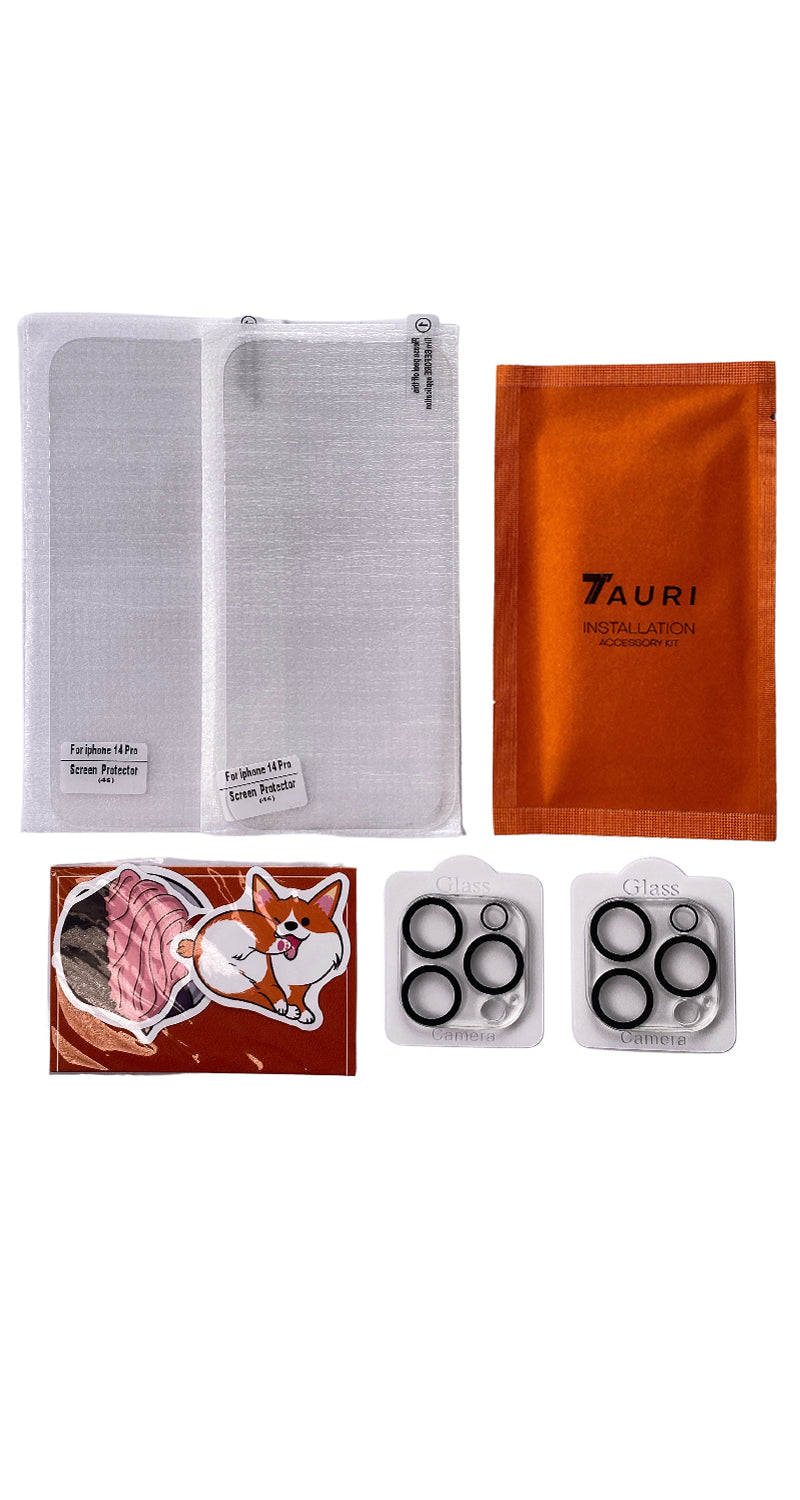 Para iphone 14 Pro. Incluye 1 carcasa transparente, 2 protectores de pantalla, 2 protectores de cámara, stikers.