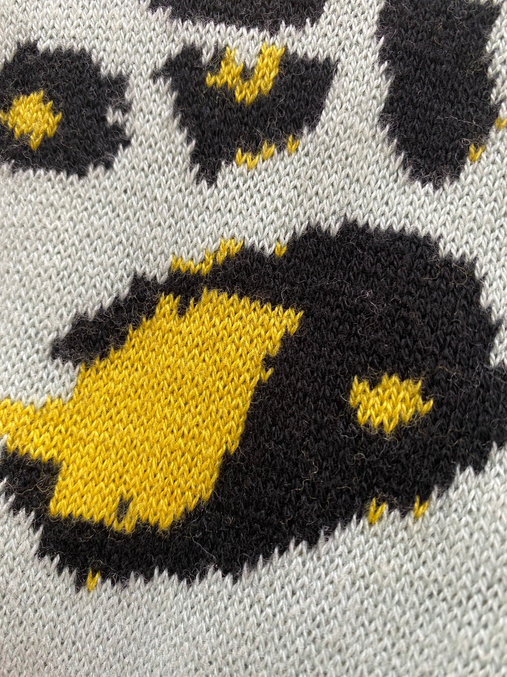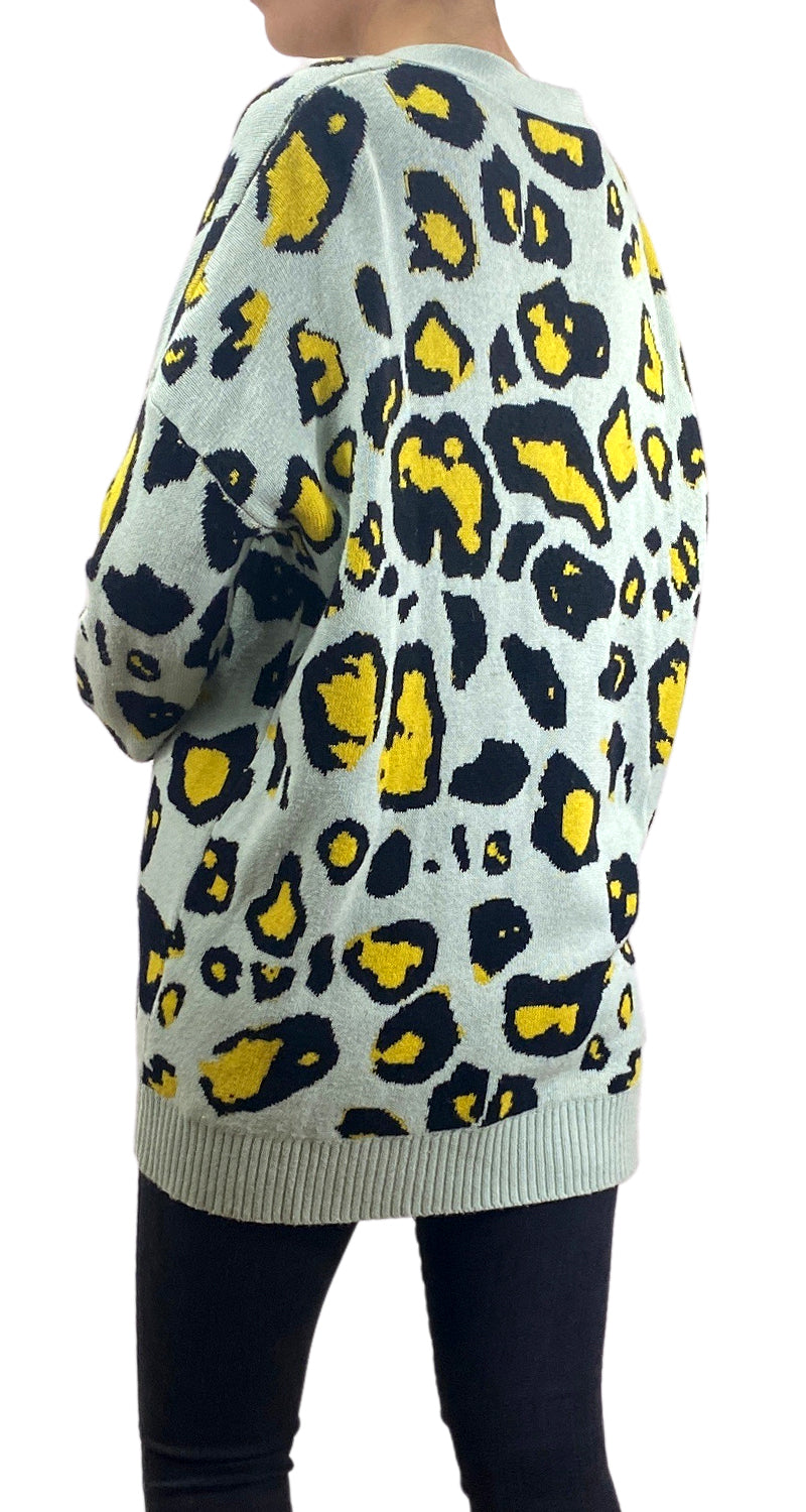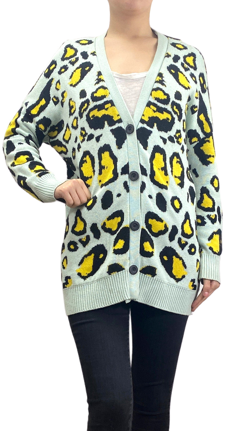 Cardigan tejido Animal Print en tonos Celeste Pastel, Amarillo y Negro. Talla única Presenta leves signos de uso.