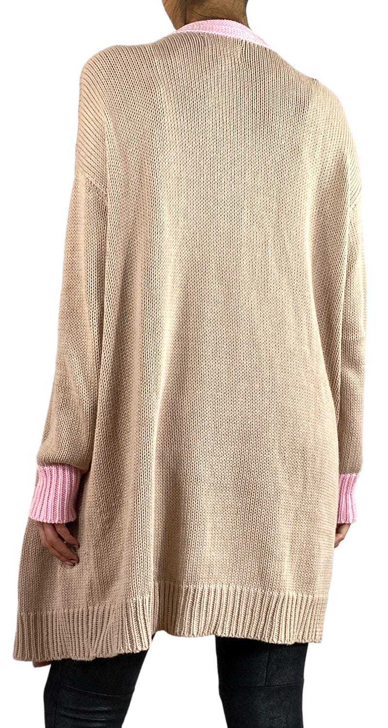 Cárdigan color Beige con borde Rosado, 5 botones en delantero. Talla U de la marca.