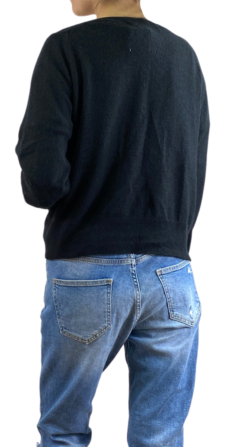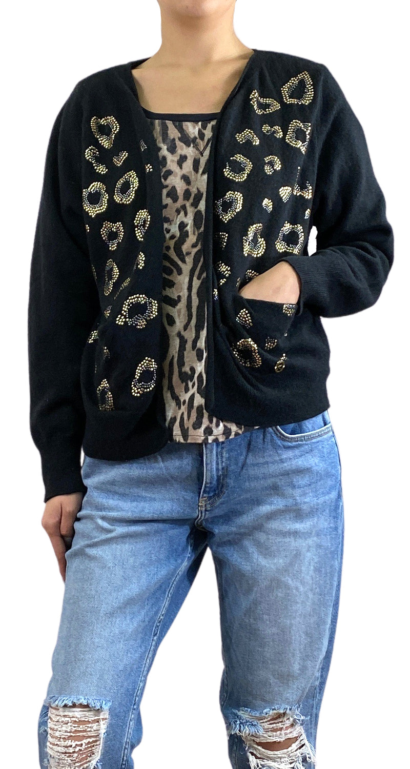 Cárdigan color Negro abierto con aplicaciones y bolsillos en delantero.