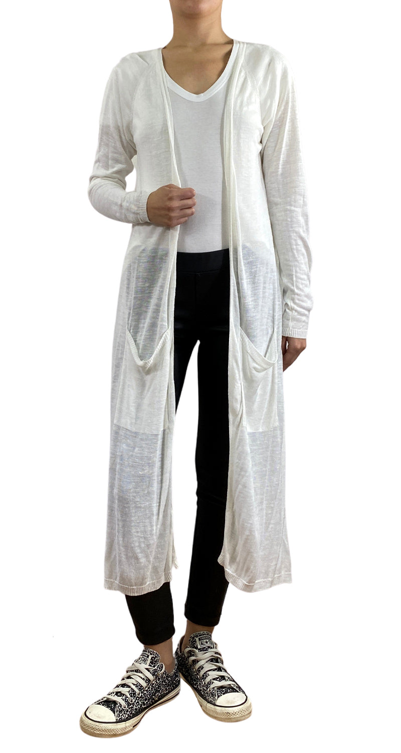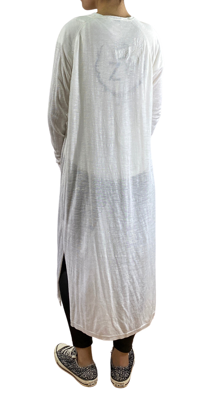 Sweater estilo Cárdigan largo en color Blanco con bolsillos en delantero y estampado bordado en espalda, abertura en laterales. Talla 2 de la marca.