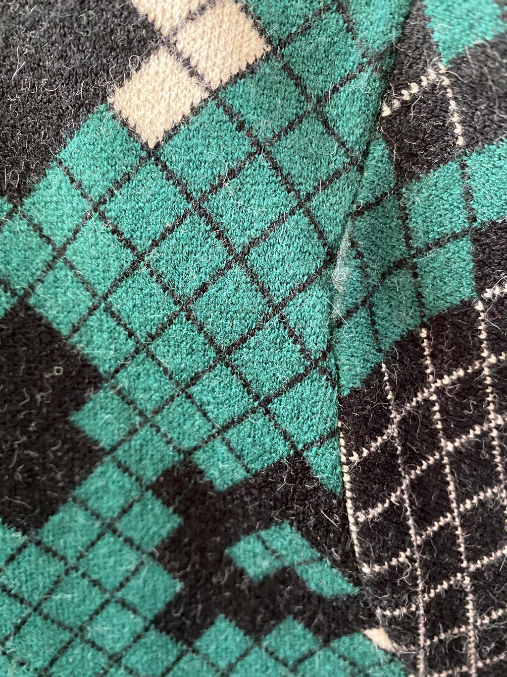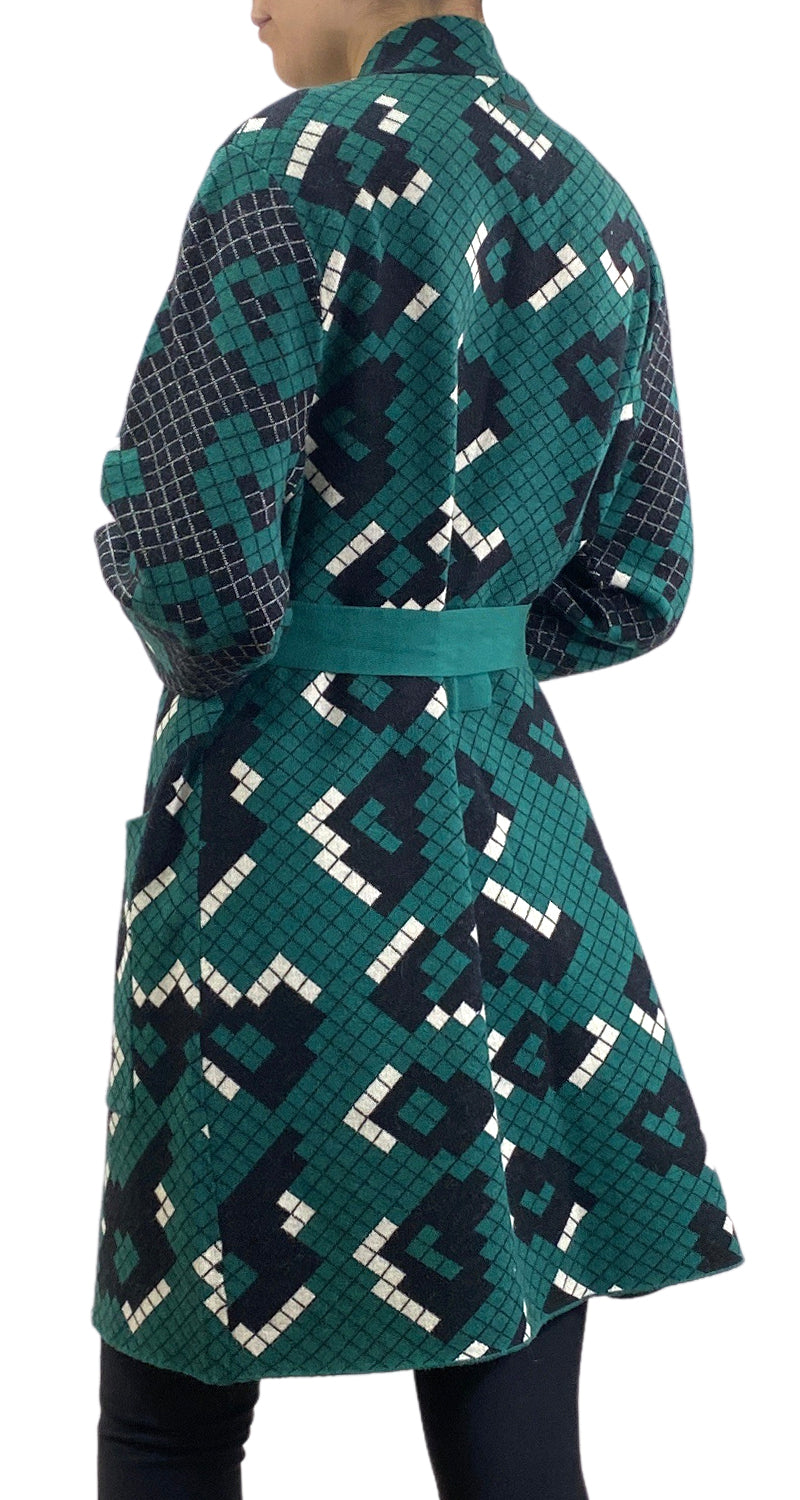 Cárdigan color Verde con diseño de cuadros, bolsillos sobrepuestos frontales y cinturón. Talla U de la marca. Presenta moderados signos de uso.