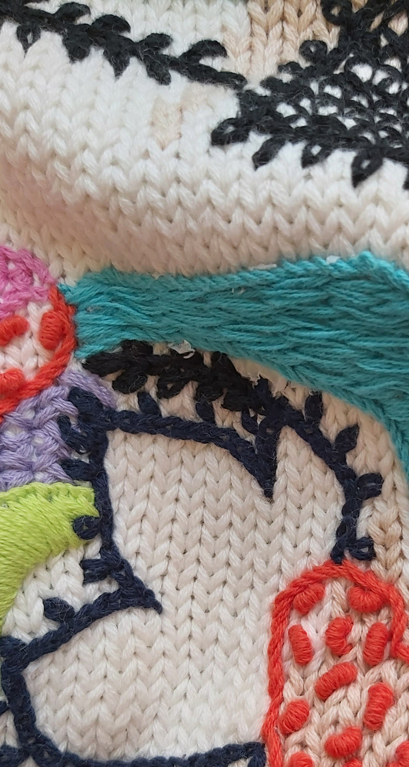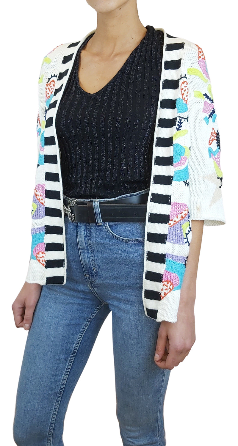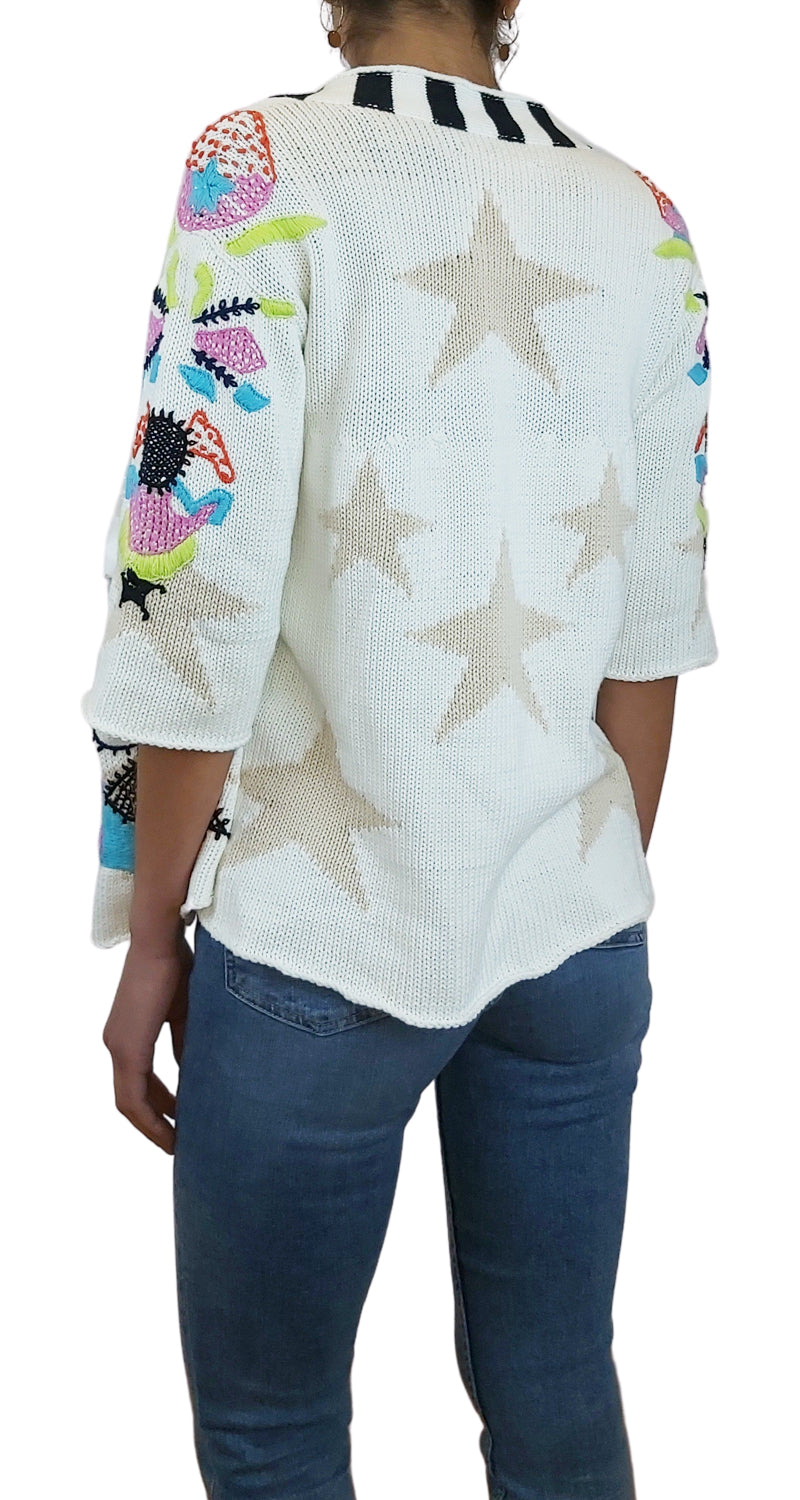 Cardigan color Beige con detalles bordados Multicolor y diseño de estrellas en espalda. Talla 1 de la marca.
