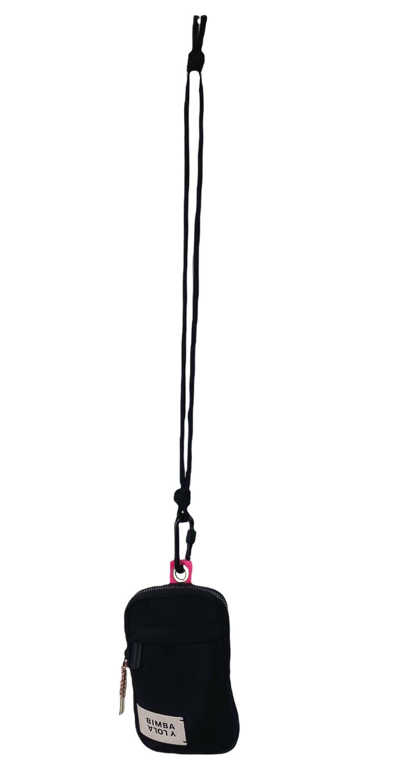 Minibolso para móvil en color negro. Modelo con bolsillo exterior, cierres de cremallera, bolsillo de rejilla en la parte trasera y mosquetón color Negro. Incluye bolsa protectora. Medidas: 17 cm de alto x 11 cm de ancho