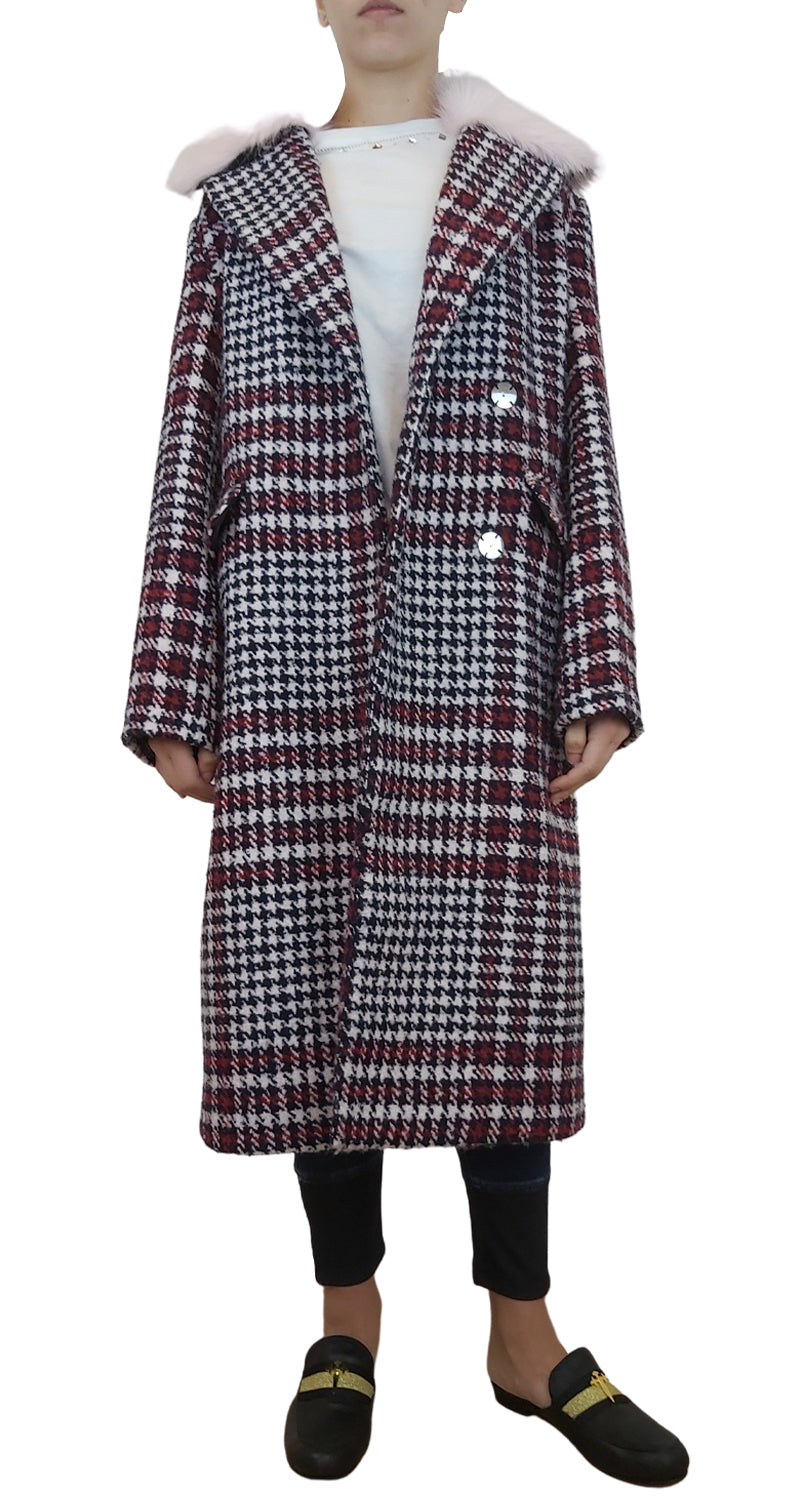 Abrigo largo de tartán en tonos Rojos, Negro y Blanco. Bolsillos en delantero y Piel sintética Rosa en cuello. Tallas EUR 38 / US 6 / UK 10.